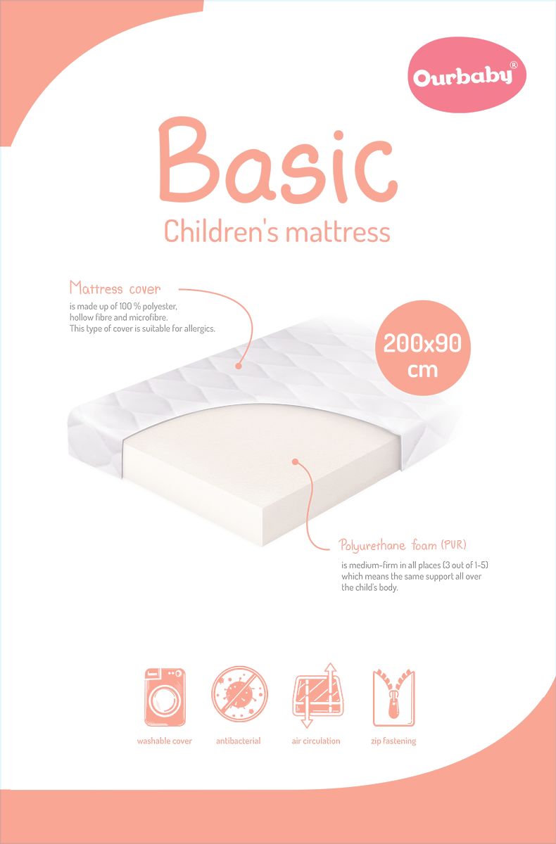 Rad BASIC - Základný rad matracov našej značky Ourbaby® , pod ktorým produkujeme nielen matrace. Penové matrace BASIC ponúkame v rozmeroch pre deti každého veku. PUR pena matraca je stredne tuhá. Detské matrace BASIC sú najlepšou voľbou pokiaľ zháňate kvalitný matrac za prijateľnú cenu.