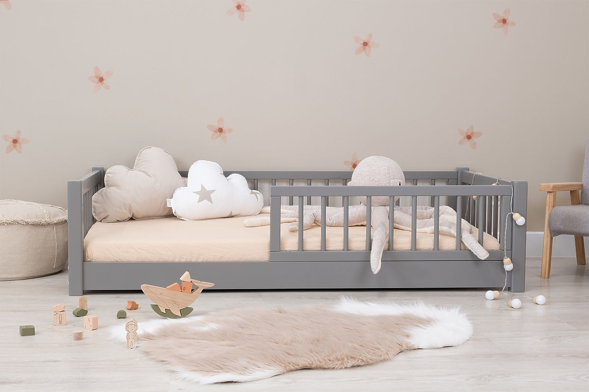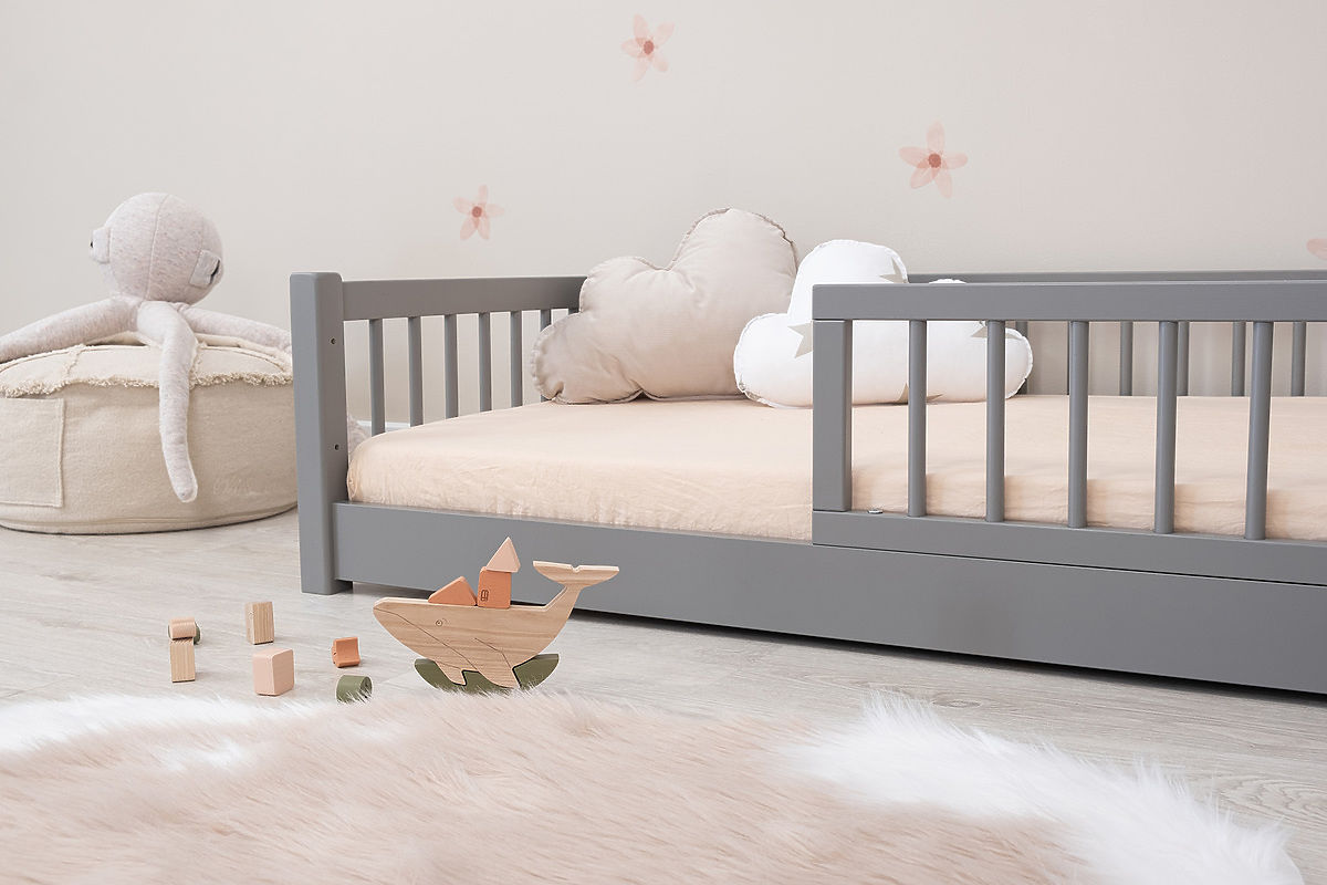 Ponúkame vám detskú posteľ Ourbaby, navrhnutú s ohľadom na princípy Montessori. Nízka výška umožňuje deťom samostatne vyliezť aj zliezť bez asistencie rodičov, čím podporuje ich nezávislosť a sebavedomie. Zábrana po obvode postele zaisťuje bezpečný spánok bez rizika pádu. Sivá farba dodáva nevšedný vzhľad a zaujímavé možnosti kombinácie s doplnkami.