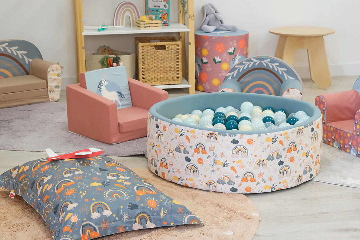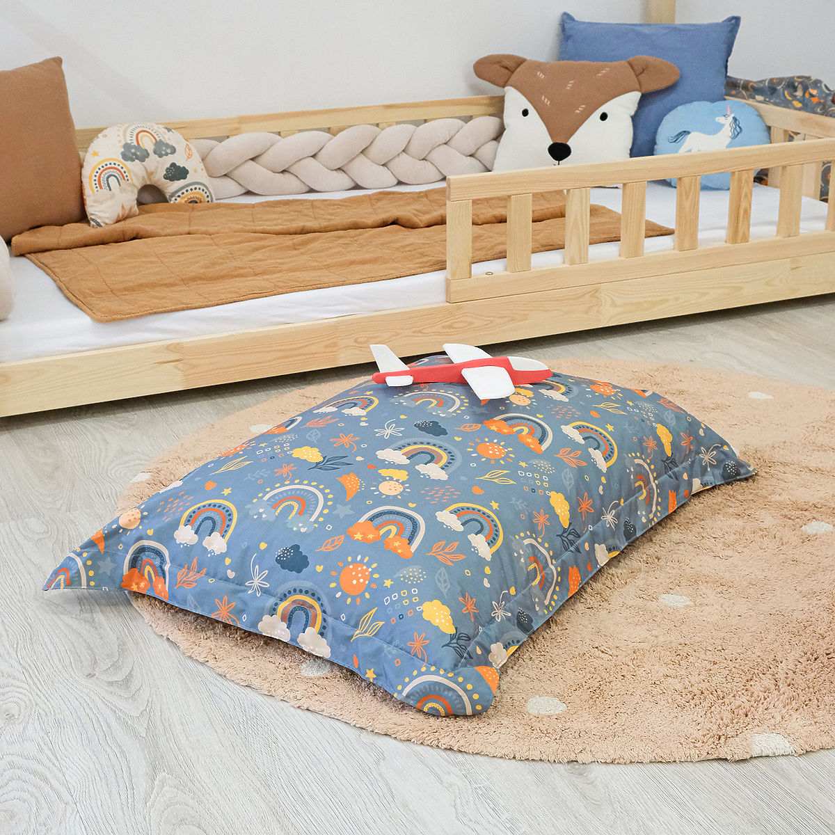 Elegantný Sedací vak Dúha je nesmierne pohodlný a ľahko prenosný a vytvára pre vaše dieťa útulné miesto. Je dokonalým spoločníkom pre domáce aktivity, ako je čítanie, hranie alebo relaxácia . Jeho príjemná modrá farba s veselými dúhami prináša do priestoru radostnú atmosféru.