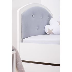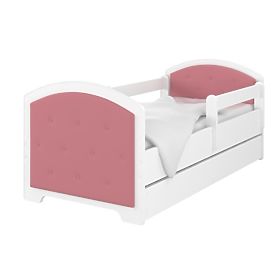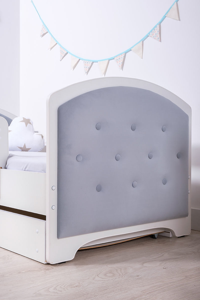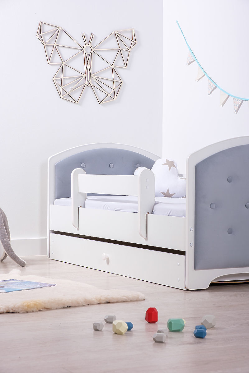 Čalúnená detská posteľ. Súčasťou postele sú dve zábrany, úložný priestor a rošt z borovicového masívu.