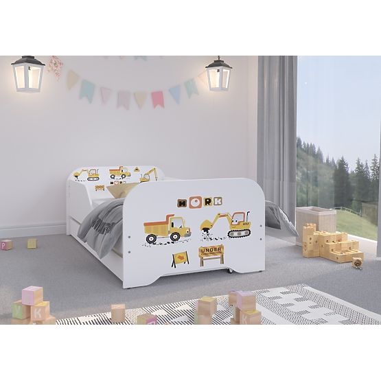 Biela detská posteľ Miki s bezpečnostnou zábranou s potlačou stavebných strojov s rozmermi 160 x 80 cm. Súčasťou postele sú dve postranné zábrany a posteľový .. viac