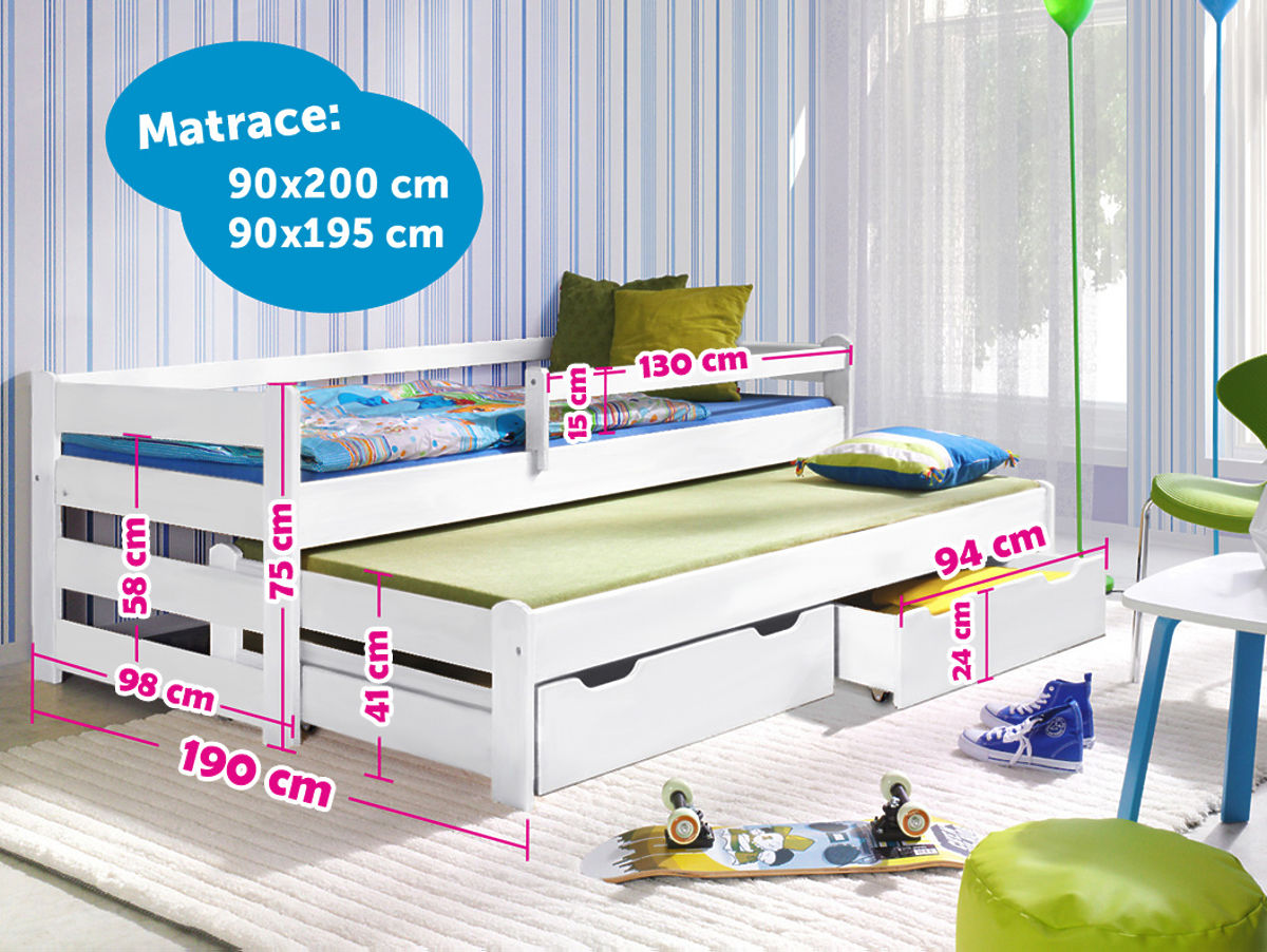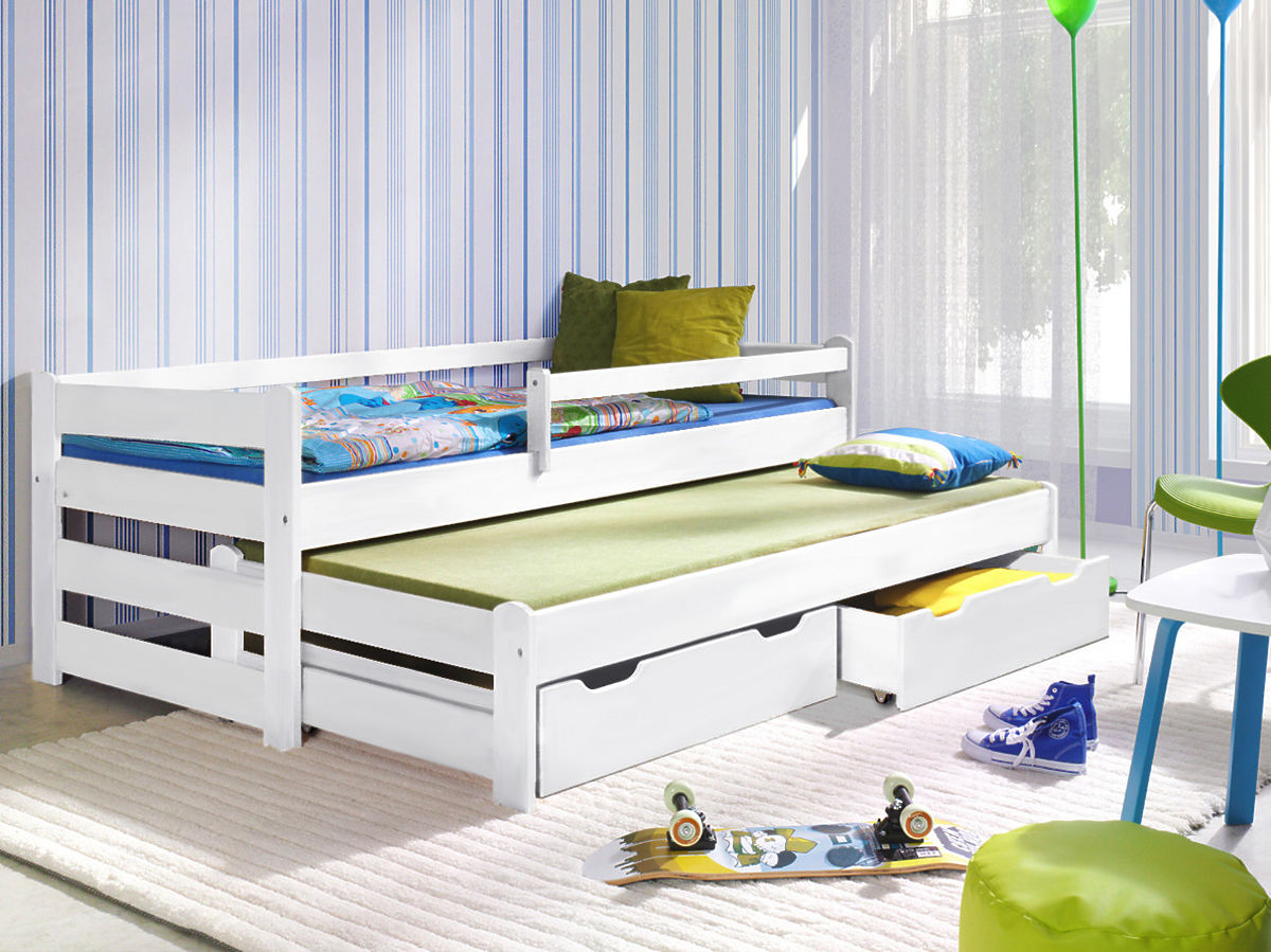 Detská posteľ s prístelkou doplo so zábranou v bielej farbe, je precízne vyrobené z prírodného dreva. Súčasťou postele je latkový rošt. Posteľ je ľahko zmontovateľné za pomocou skrutiek, kolíkov, ktoré sú súčasťou balenia.