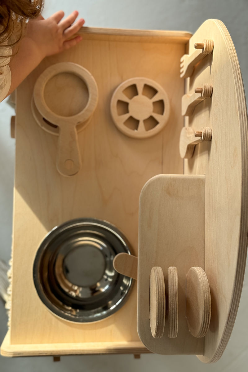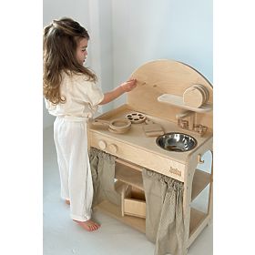 Detská drevená kuchynka je ideálnou hračkou pre všetkých malých šéfkuchárov. Táto kvalitná a detailne prepracovaná kuchynka podporuje kreativitu, hravosť aj učenie. Deti môžu variť, piecť, objavovať kulinársky svet, užiť si veľa zábavy a zároveň rozvíjať svoju fantáziu a manuálne zručnosti.