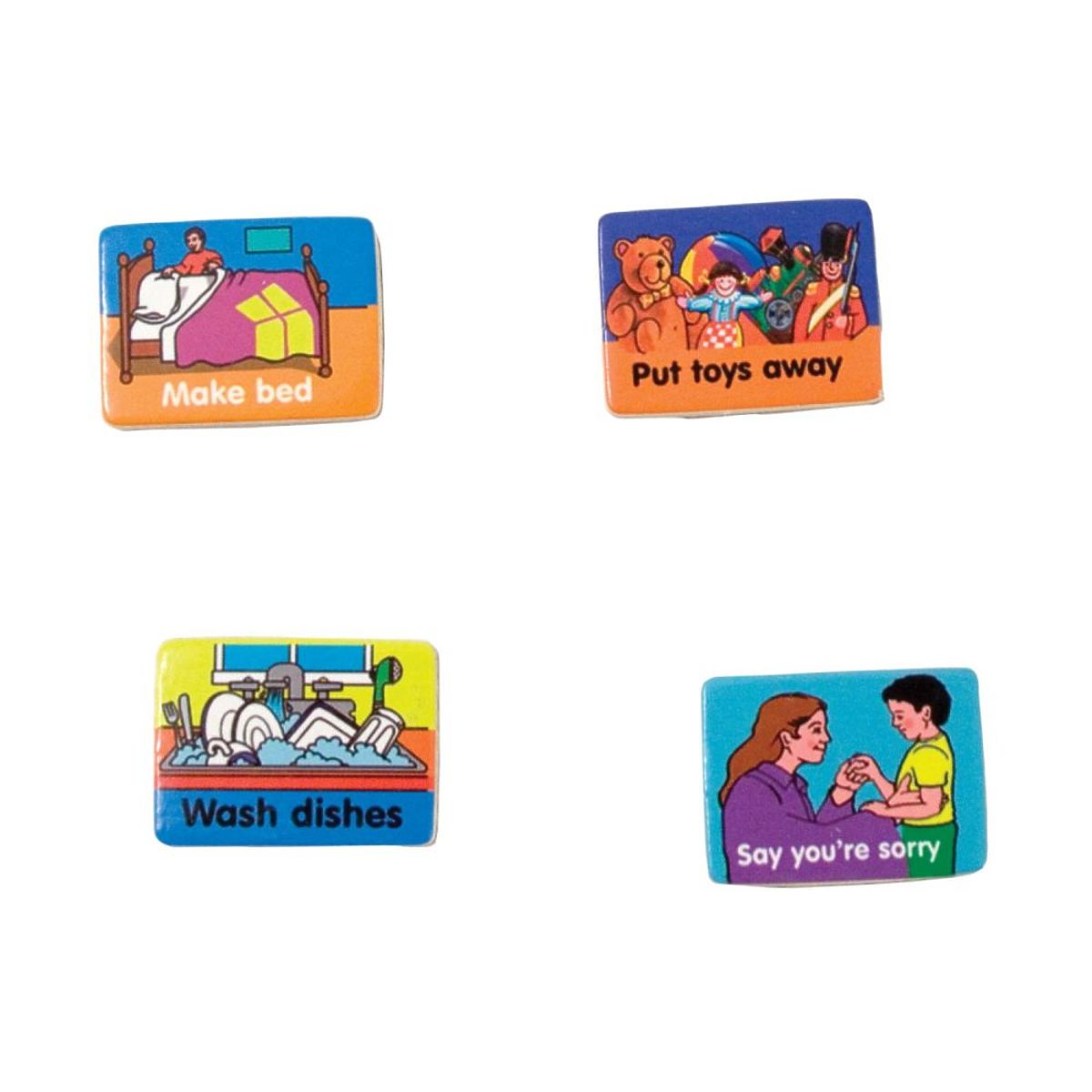 Celé vo veľmi farebnom prevedení, aby dieťa povzbudilo k spoločnému plneniu stanovených cieľov. Vďaka tabuli učíte dieťa zodpovednosti a posilňujete jeho motiváciu k každodennej práci. Navyše sa dieťa môže samo dobre zabávať výberom vlastných úloh do sady a značiek, ktoré bude za ich plnenie dostávať. Každodenné pripínanie značiek môže byť vašou súkromnou ceremóniou.