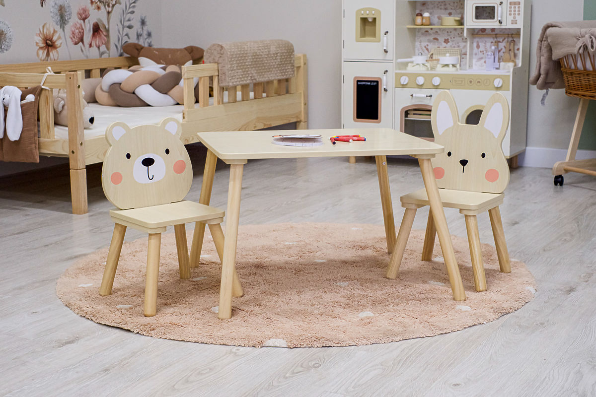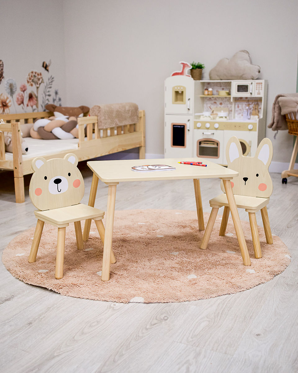 Premeňte detskú izbu alebo herňu na veselý a hravý priestor s naším dreveným stolčekom a sadou dvoch stoličiek „Priatelia z lesa“. Tento set je ideálny pre malých objaviteľov a tvorcov, ktorí si chcú maľovať, stavať alebo hrať sa s priateľmi.