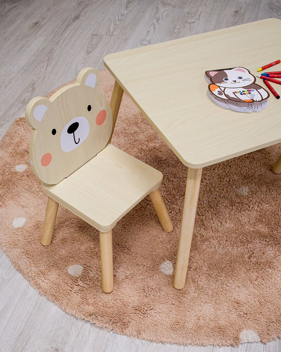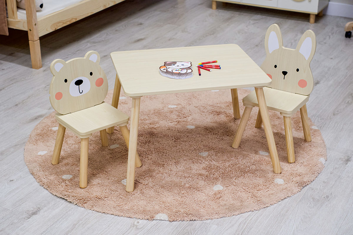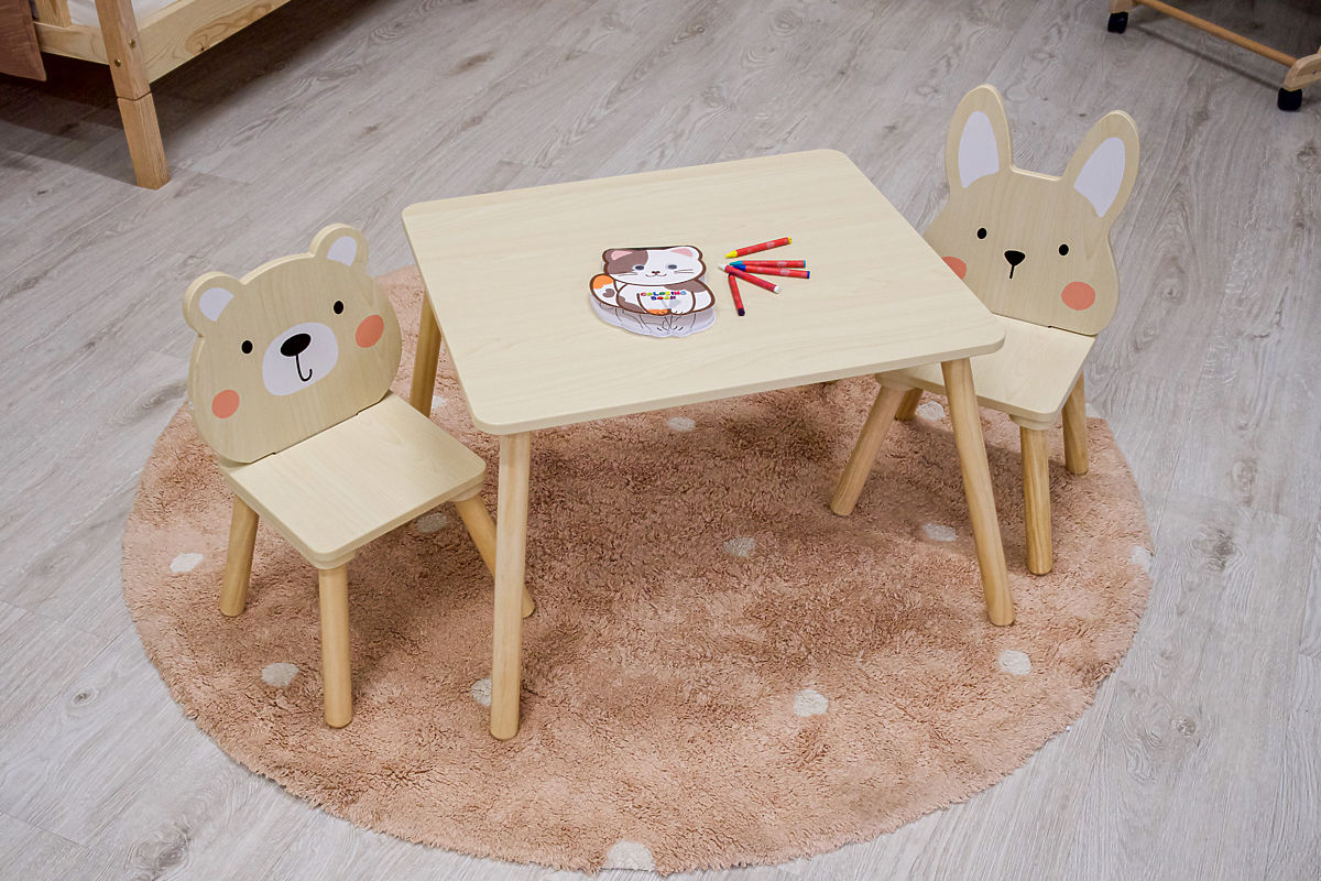 Drevený stolček a stoličky s motívom lesných priateľov pre deti. .. viac