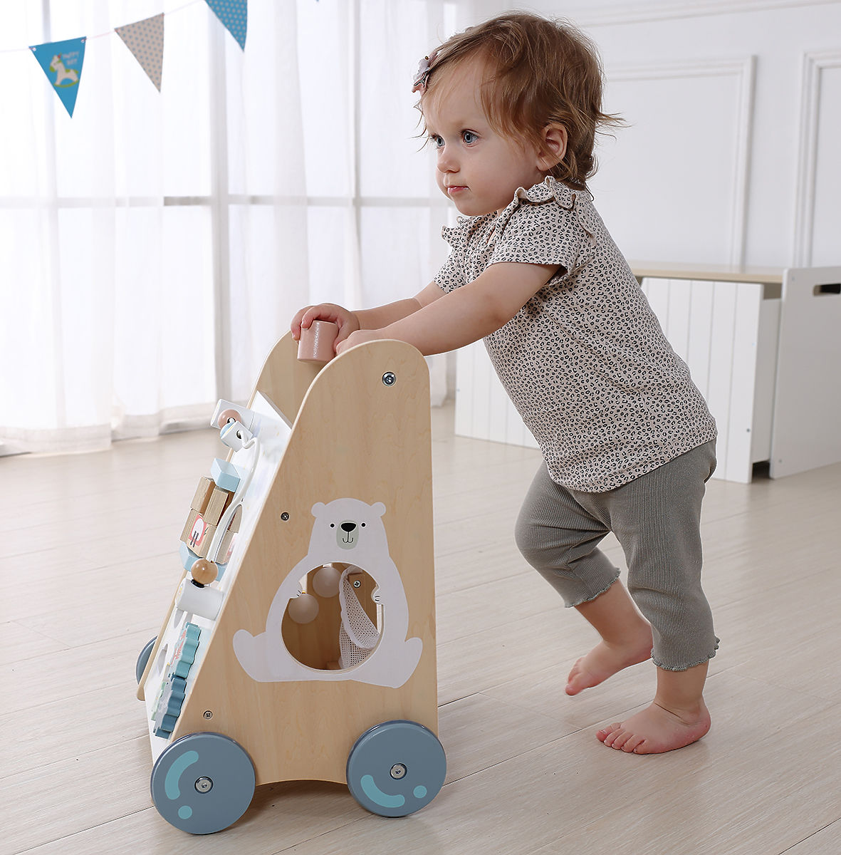 DREVENÉ CHODÍTKO Pre deti od 18 mesiacov Podporuje dieťa pri učení chôdze Hračka vyrobená z dreva Odolná, stabilná konštrukcia Vzdelávací panel s pohyblivými .. viac