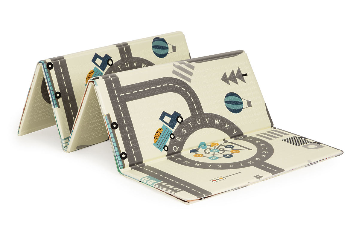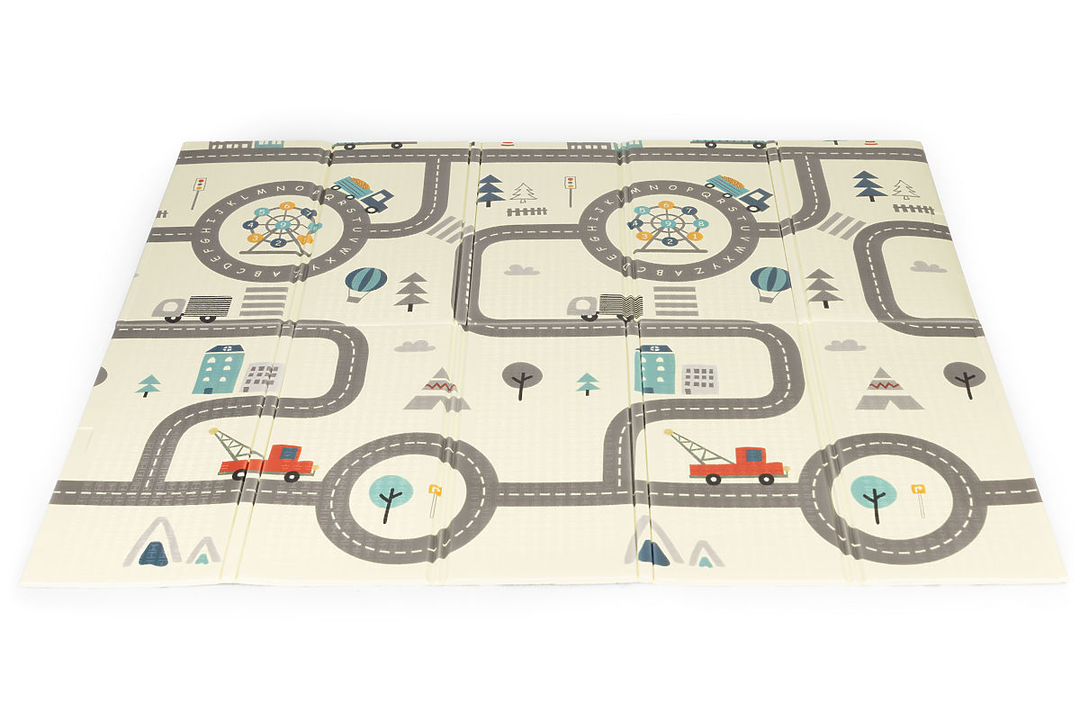 DÔRAZ NA BEZPEČNOSŤPodložka je mimoriadne praktická, dá sa ľahko skladať a rozkladať, čo uľahčuje jej skladovanie a prenášanie. Dve strany poskytnú veľa zábavy, na jednej strane sa nachádza grafika mesta s ulicami, na druhej strane sú umiestnené farebné grafiky zobrazujúce rôzne zvieratká a ovocie.
