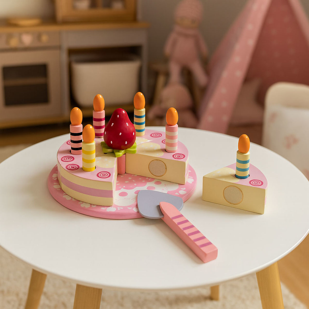 SKVELÉ DOPLNKYVkladacie sviečky do drevenej torty dodávajú autentickosť a umožňujú deťom hrať veselé scény z narodeninových osláv. Drevená jahoda dodáva farbu a chuť celej hre. Deti ju môžu použiť na dekoráciu svojej torty, čím zároveň zdokonaľujú svoje motorické a manuálne zručnosti.