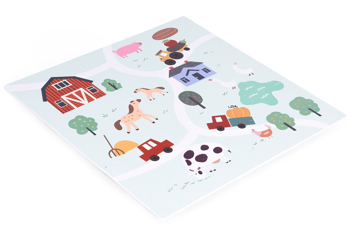 SKVELÁ ZÁBAVAPodložka predstavuje farebný vzor farmy, plný vozidiel a tiež hospodárskych zvierat a vidieckych krajín. Vďaka tomu poskytuje deťom kreatívnu a fascinujúcu formu zábavy, ideálnu pre malých milovníkov vidieka. Každý detail na podložke bol starostlivo navrhnutý s dôrazom na detaily, aby povzbudil deti k objavovaniu a interakcii s okolím. Výrazné farby a realistické ilustrácie vzbudzujú záujem a rozvíjajú predstavivosť, pozývajú k vytváraniu vlastných dobrodružstiev na farme.