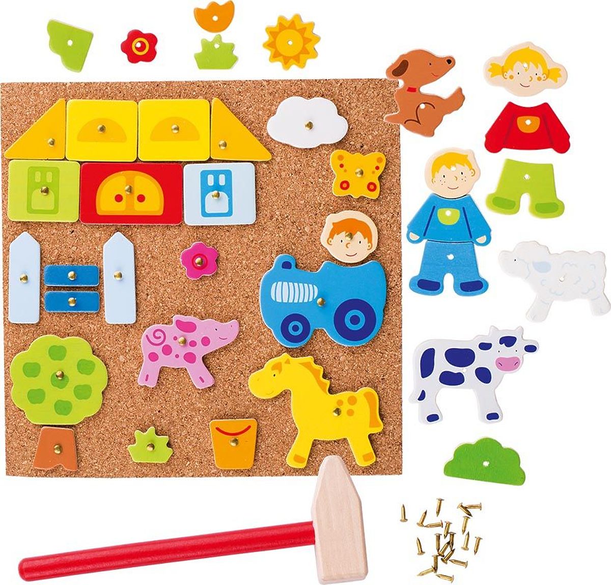 Korková zatĺkacia hra Farma je skvelá skladačka, ktorá precvičuje manuálne zručnosti a obratnosť prstov našich najmenších. Stačí vybrať tvary a pripevniť ich na korkovú dosku tak, aby vznikol obrázok. Dieťa môže pomocou svojej predstavivosti vytvárať úžasné príbehy o dedine a jej obyvateľoch.
