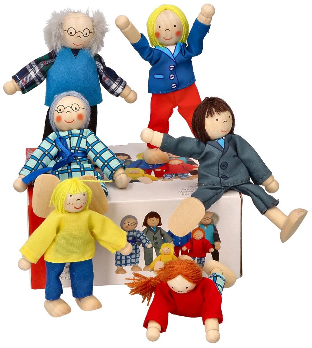 Bábiky sú vyrobené z dreva v látkových oblečeniach. Nohy a ruky bábik je možné ohýbať tak, aby mohli napr. sedieť. Celý set je zabalený v pohodlnom a estetickom kartónovom balení, v ktorom môžeme bábiky pohodlne skladovať. Rozmery: výška bábik 11 cm, výška detí 8 cm. Vek: 3 + Referenčné číslo: SO218 Vyhlásenie o zhode CE