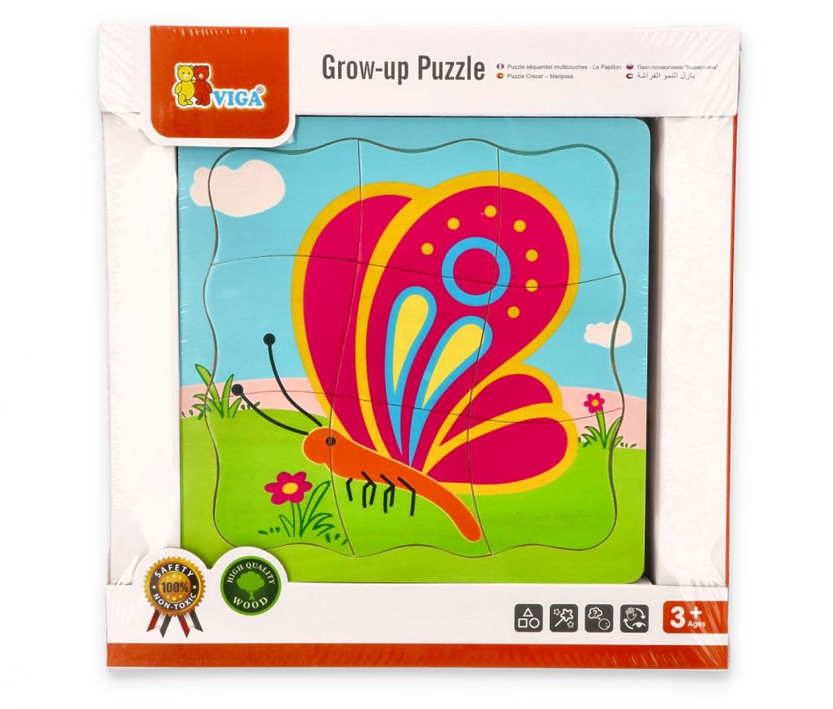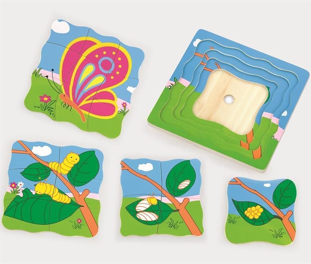 Ďalšou vzdelávacou hodnotou hračky je ukážka, ako sa rodí krásny motýľ od malých vajíčok, cez kuklu, húsenicu až po krásneho farebného motýľa. Každá vrstva predstavuje ďalšiu fázu, vďaka čomu dieťa spoznáva rôzne fázy vývoja. Každá ďalšia vrstva obsahuje viac dielikov na zloženie. Na prvej vrstve je jeden dielik, na druhej štyri, na tretej šesť a na poslednej deväť. Dieťa musí nielen zložiť puzzle, ale aj vybrať z dostupných dielikov tie, ktoré patria do danej vrstvy.