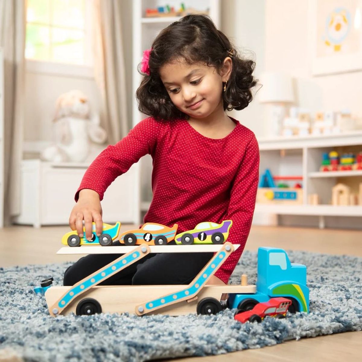 Nové závodné autá už idú z továrne. Mieria priamo na trať, kde začne veľký závod! Alebo možno idú do dielne na nejakú opravu. Existuje predsa mnoho možností a príbehov, ktoré si môžete vymyslieť s takýmto návesom.