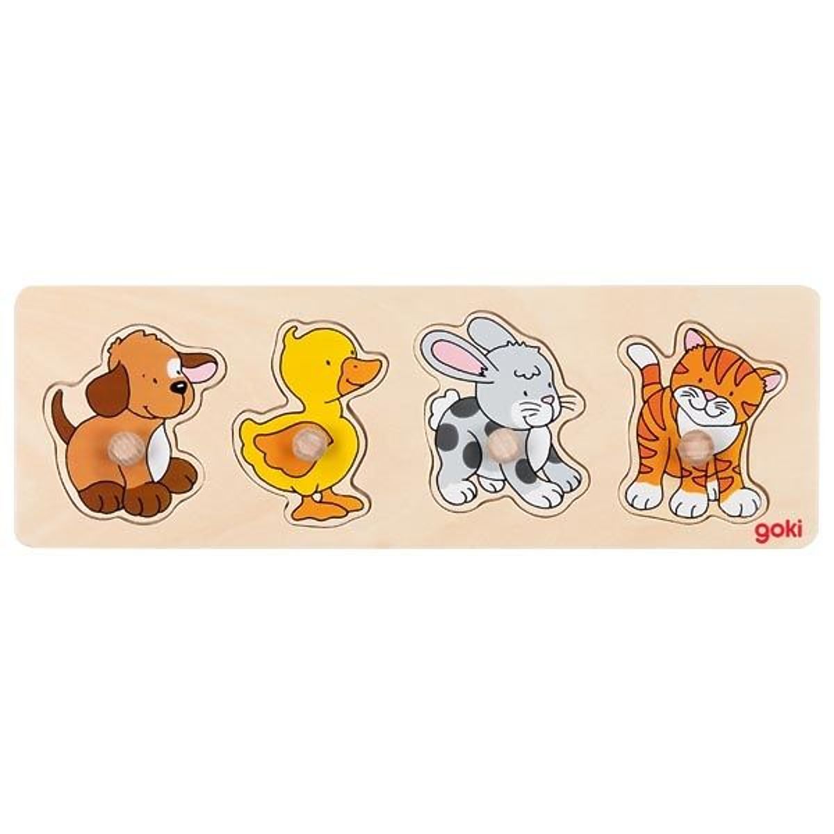 Malá skladačka ponúka 4 puzzle s úchytmi so zvieratkami ako sú: psík, kačička, zajačik a mačička. Pod nimi sa nachádza aj farba zodpovedajúca danému zvieratku. Priraďovanie puzzlí do otvorov rozvíja motoriku dieťaťa a zvyšuje jeho záujem o okolitý svet.