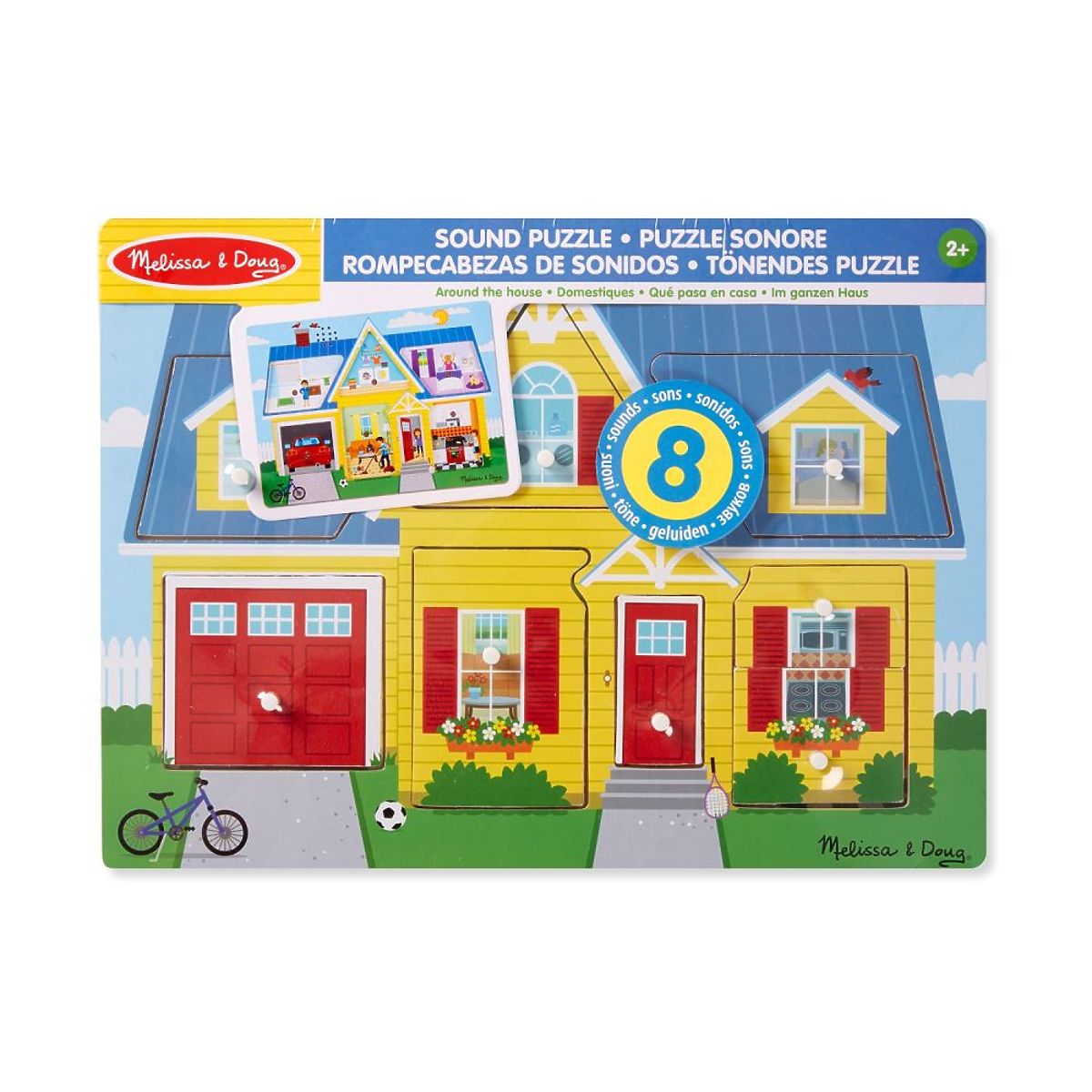 Dieťa sa hrá s puzzle a prispôsobuje dieliky prázdnym miestam. Po vložení dielika na svoje miesto dieťa počuje zvuk. Pozrite sa, čo možno vidieť a počuť okolo domu. Zvuk je prispôsobený obrázku. Dieťa môže počuť zvuk budíka v spálni, štartovanie auta v garáži alebo syčanie pripravovaného jedla na sporáku. Pozrite sa sami, koľko ďalších prekvapení je v tejto skladačke ukrytých.