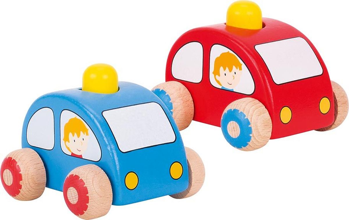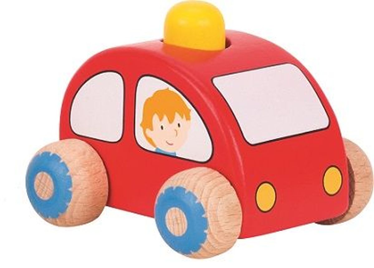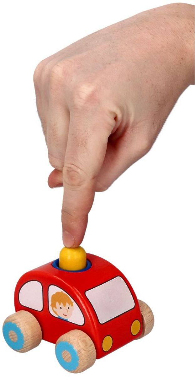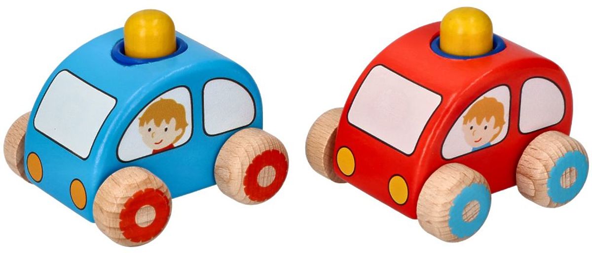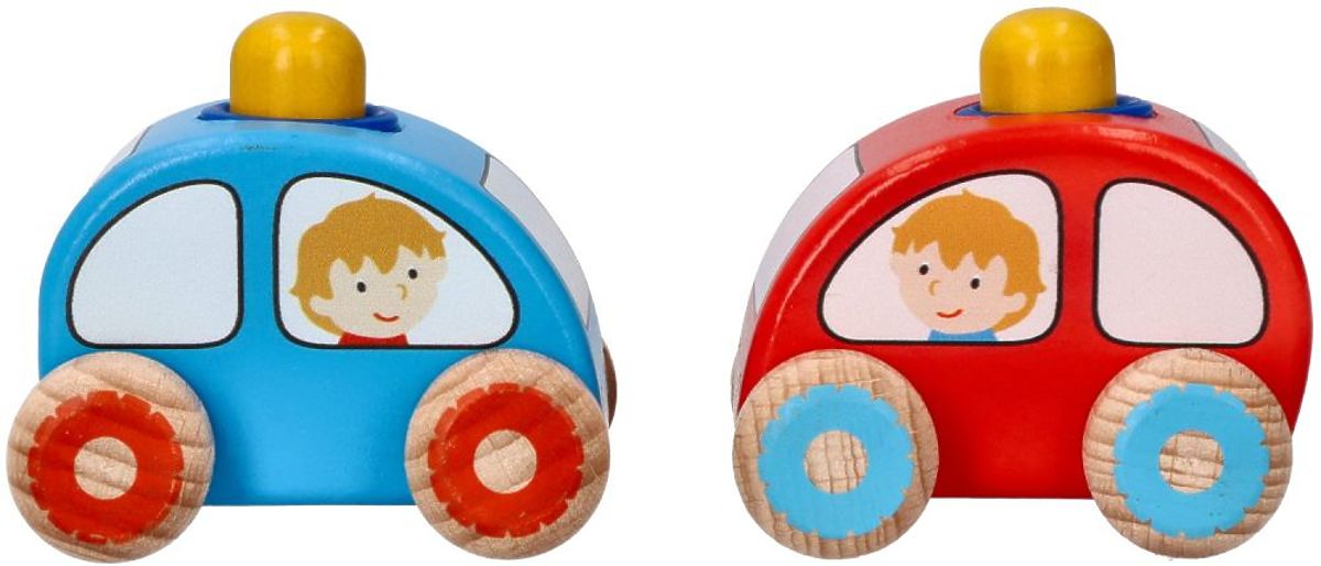 Drevené autíčka pre malé deti nie sú len hračkou, ale aj pomôckou pri učení uchopovania. Autíčka sú veľkostne prispôsobené malým rúčkam a vyrobené s dôrazom na detaily. V okne vozidla môžete vidieť veselého vodiča. Červené autíčko s modrými kolesami bude priťahovať pozornosť dieťaťa.