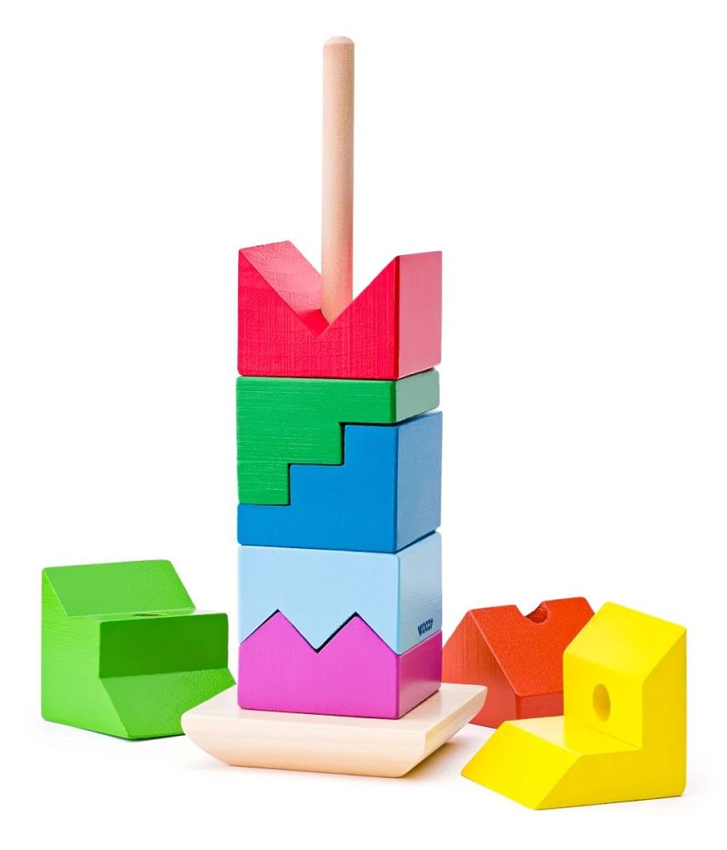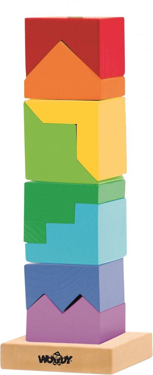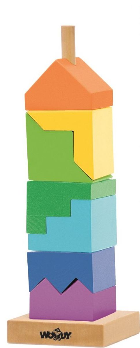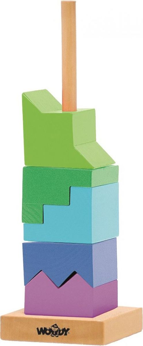 Sada obsahuje základňu s tyčkou a 8 farebných kociek (každá kocka v inej farbe). Skladačka vďaka farebným a zaujímavo vyrezávaným vzorom láka k hre.