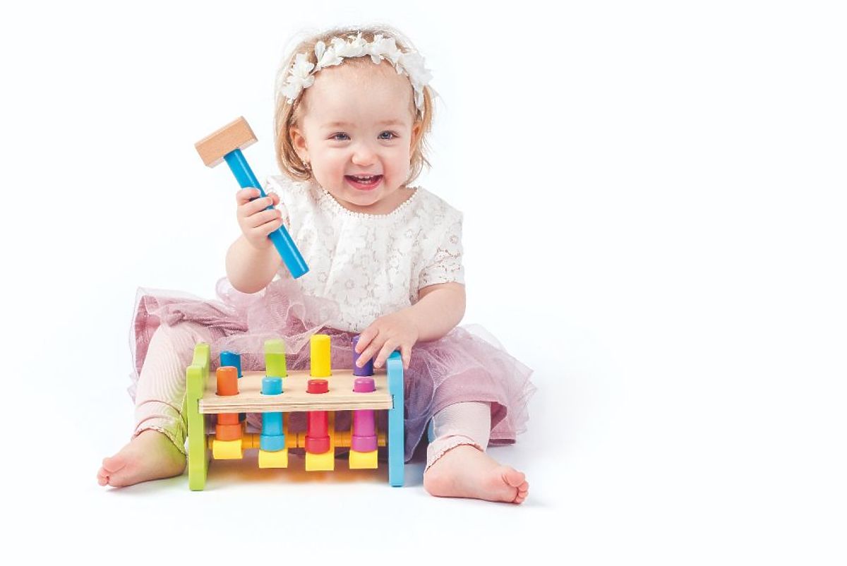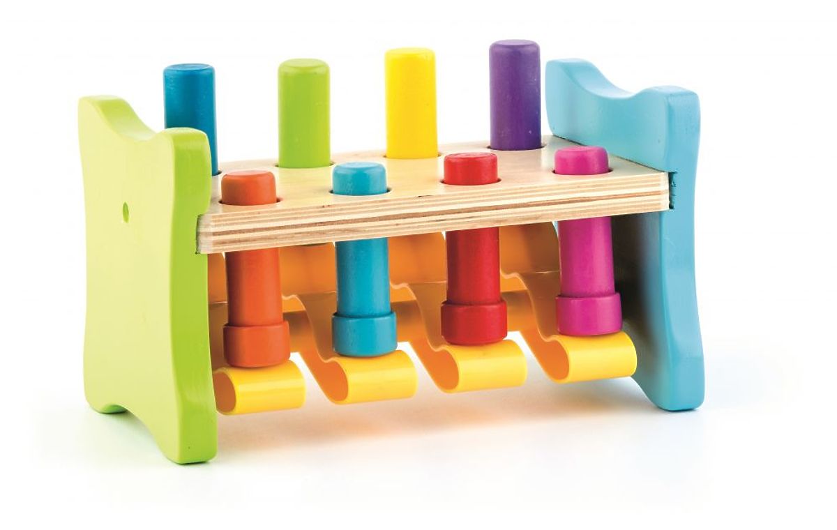 Pri hraní si dieťa zlepšuje koordináciu zraku a pohybu. Zručnosť ručičiek sa výrazne zlepšuje - dieťa stále rýchlejšie, presnejšie a silnejšie udrie do kolíkov.