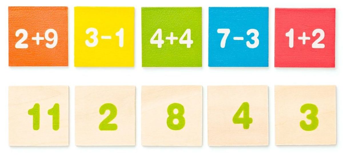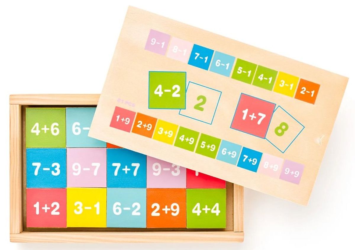 V drevenom balení sa nachádza 81 drevených doštičiek, na ktorých je z jednej strany úloha a z druhej riešenie. Stačí otočiť doštičku a výsledok sa objaví pred očami dieťaťa. Každé číslo má priradenú inú farbu, čo robí doštičky atraktívnejšími. Teraz sčítanie a odčítanie nebude len učením, ale aj zaujímavou zábavou. Môžete tiež usporiadať kvíz. Vďaka spojeniu obrázku a pohybu bude učenie ľahšie. Je to najlepší spôsob, ako sa učiť.