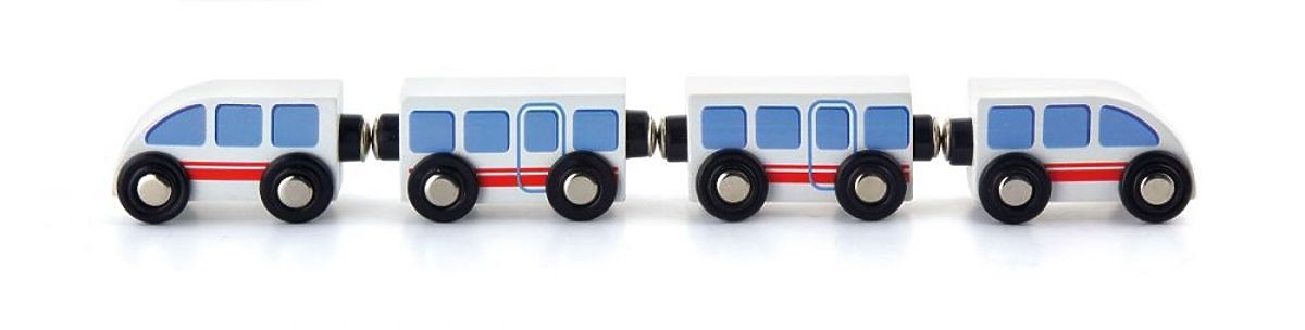 Lokomotíva ťahá za sebou tri vagóniky. Celá sada vláčika je spojená pomocou magnetov.