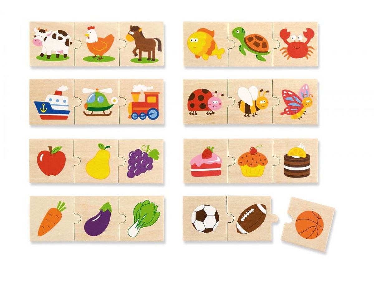 Sada obsahuje 24 drevených kociek rozdelených do 8 tematických skupín po troch puzzliach: