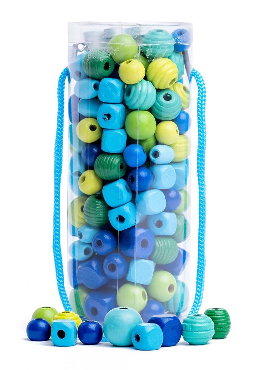Korálky vyrobené z lakovaného dreva v modro-zelenej farebnej kombinácii