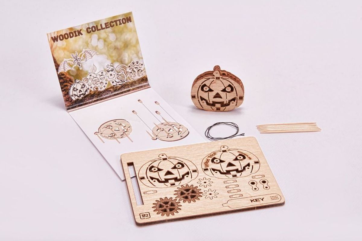 Po zložení tekvice po stranách vyčnievajú ozubené kolesá. Stačí nimi otáčať, aby sa oči tekvice hrozivo pohybovali. Ideálne sa hodí aj ako gadget na Halloween. Vyskúšajte sa! Tento zberateľský model je skvelá zábava v ekologickej, drevenej forme.