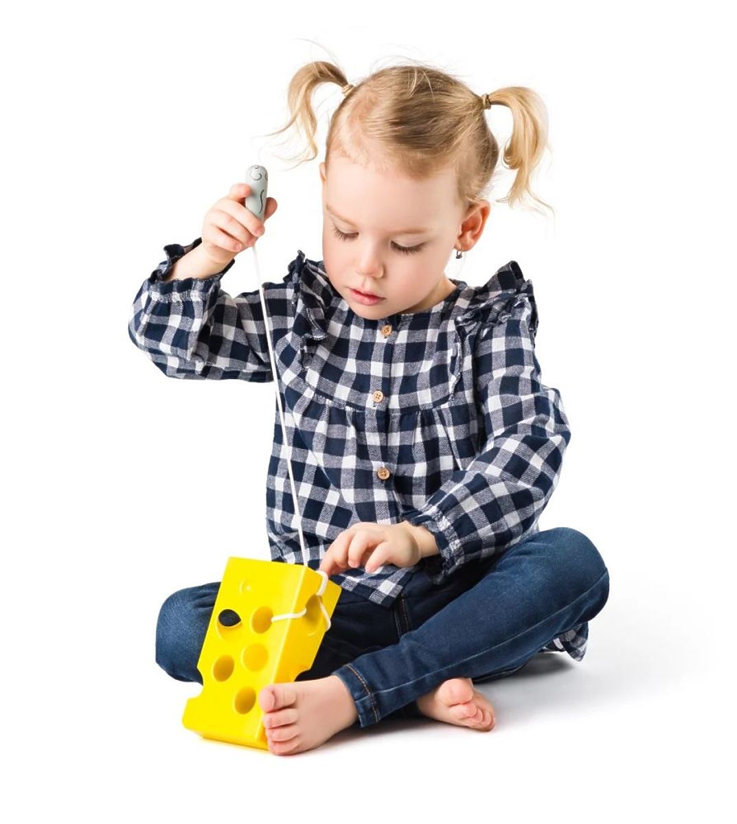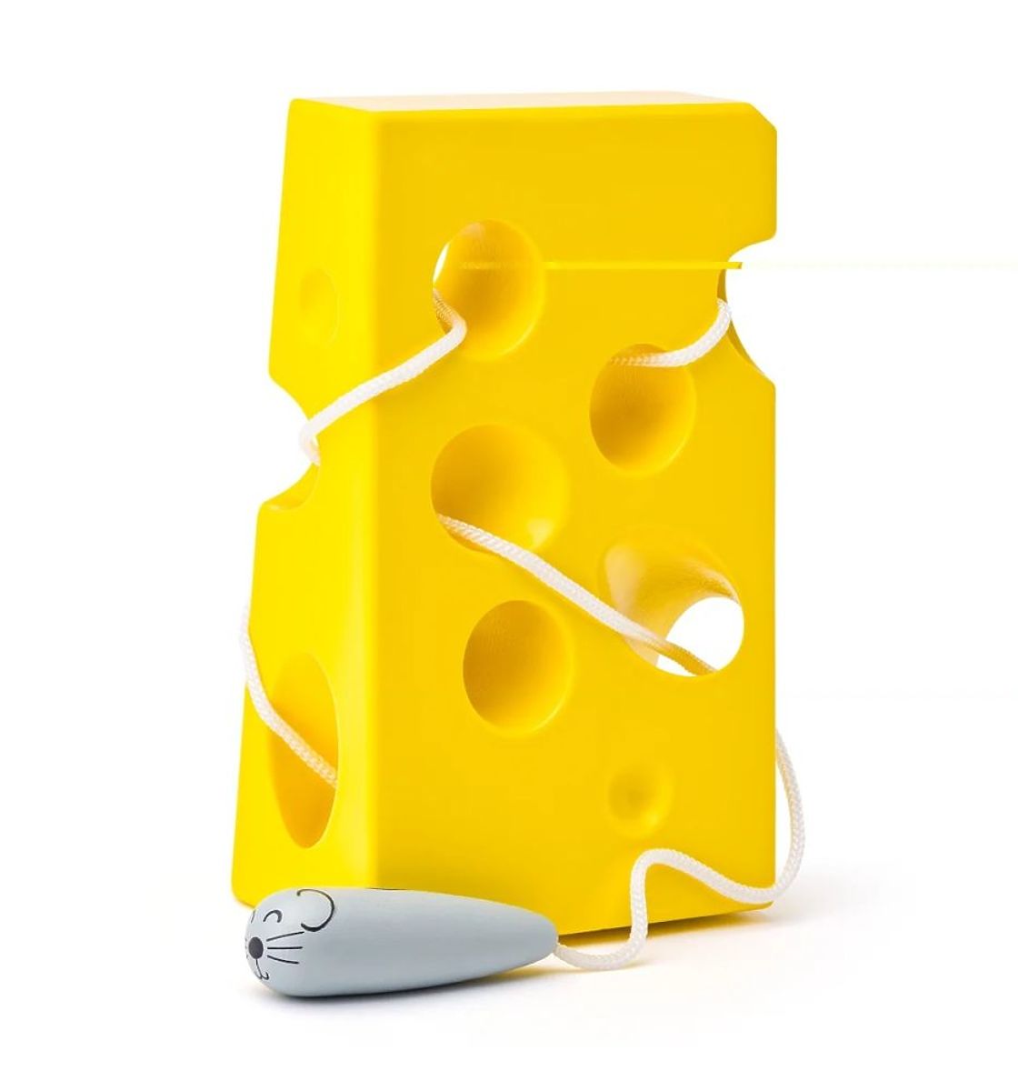 Pozrite sa, ako myške chutí tento syr. Hra spočíva v prepletaní priateľskej myšky, ku ktorej je pripevnená šnúrka, cez pripravené otvory v syre. V syre je 6 dierok, zatiaľ čo dĺžka šnúrky umožňuje ľubovoľne prepletať myšku po celom syre. Drevená myška v tvare zaobleného kužeľa s veľkou chuťou prehryzie chutný kúsok syra :)