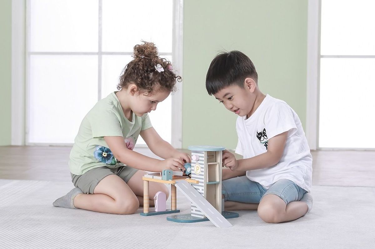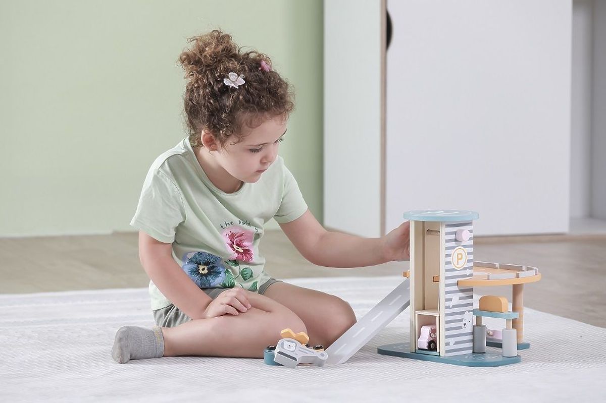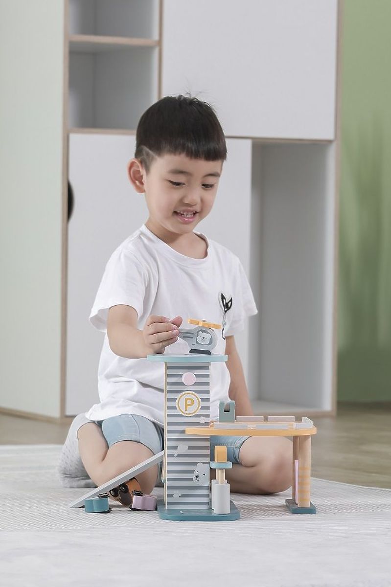 Drevené parkovisko s tromi úrovňami je snom každého malého milovníka automobilov. Teraz môžete usporiadať jazdu lesným zvieratkám. Sada získava na kúzle vďaka štyrom ďalším vozidlám. Na každom z nich je zobrazené zvieratko. Parkovisko ponúka tiež heliport, umývačku a čerpaciu stanicu. Produkt je vyrobený z dreva a na maľovanie boli použité bezpečné, netoxické farby. Odolné materiály zaručujú zábavu na mnoho ďalších rokov.