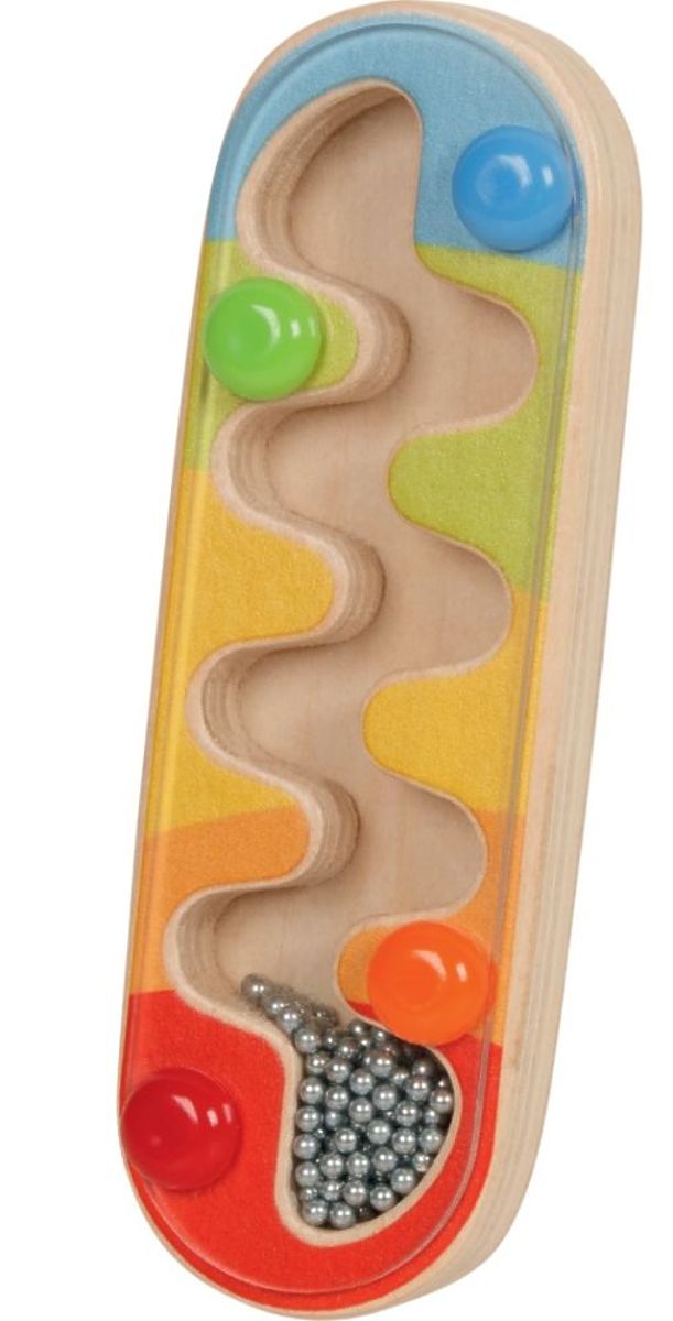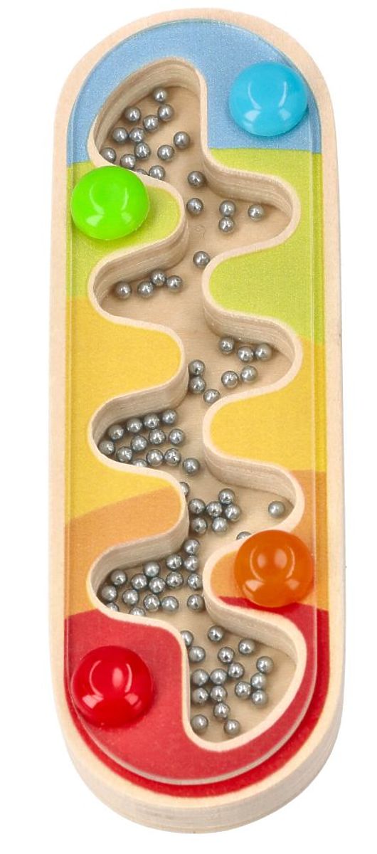 Hračka je postavená nasledovne: základňa a puzdro produktu sú drevené, priehľadná doska je plastová, zatiaľ čo guľôčky vo vnútri sú vyrobené z kovu. Tvar výrezu je takzvaný zikzak, vďaka ktorému sa guľôčky pomaly presypávajú zhora nadol. Skvelý kúsok, ktorý môžete darovať pri každej príležitosti :)