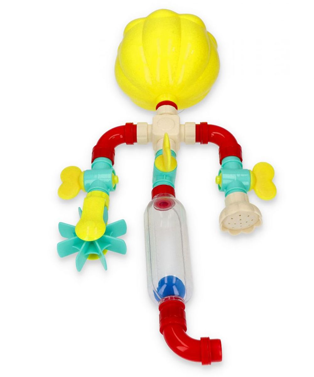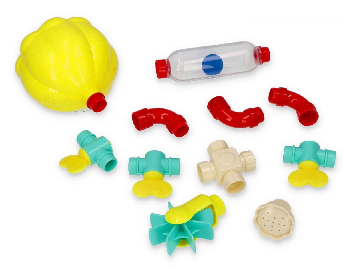 Hračku môže obsluhovať jedno dieťa, alebo dvaja súrodenci počas spoločného kúpeľa. Dospelá osoba by mala spojiť všetky časti podľa obrázka na krabici alebo podľa vlastných preferencií. Časti stačí zasunúť jednu do druhej, na montáž nie sú potrebné žiadne ďalšie nástroje. Teraz stačí len pripevniť hlavný prvok (žltý rezervoár na vodu) k stene pomocou prísaviek na zadnej strane a zábava môže začať. Nastavte kohútiky do uzavretej polohy. Pomocou pohárika, napríklad na čistenie zubov, naplňte žltý rezervoár vodou. Začíname odpočítavať ... 3 ... 2 ... 1 ... IDEME! Rozhodnutie, kadiaľ voda potečie, je na vás. Môže to byť sprchová hlavica alebo vodné koleso. Pri tom pozorne sledujte, ako sa správa loptička v rezervoári. Zábavu možno opakovať donekonečna.