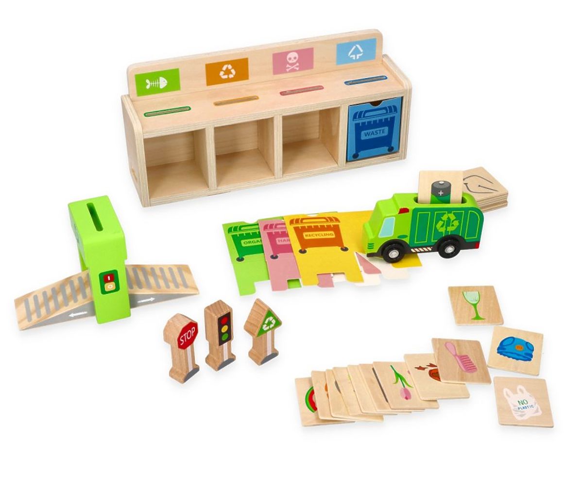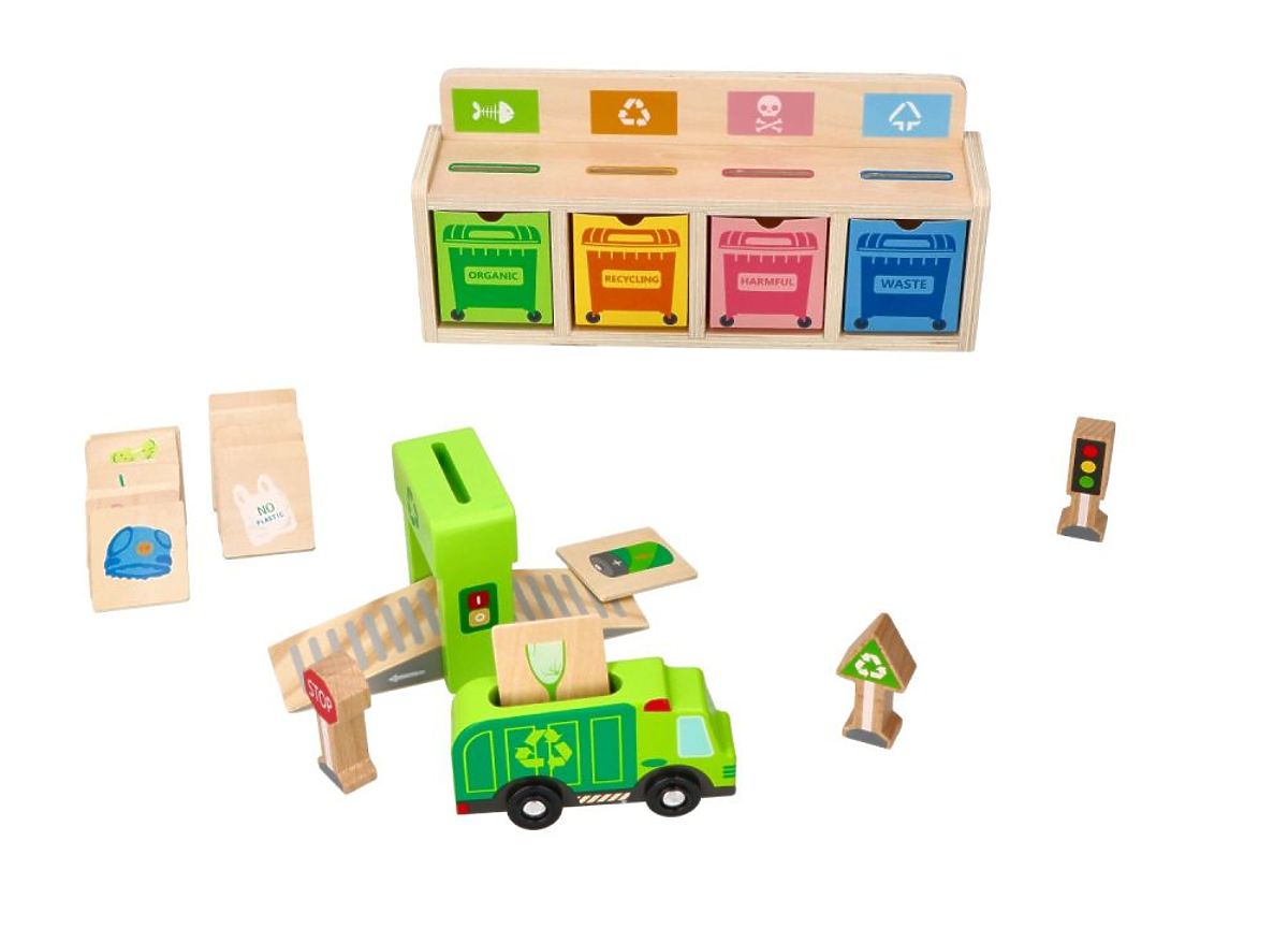Drevená triedička odpadu pre deti s pásovým dopravníkom a smetiarskym autom. .. viac