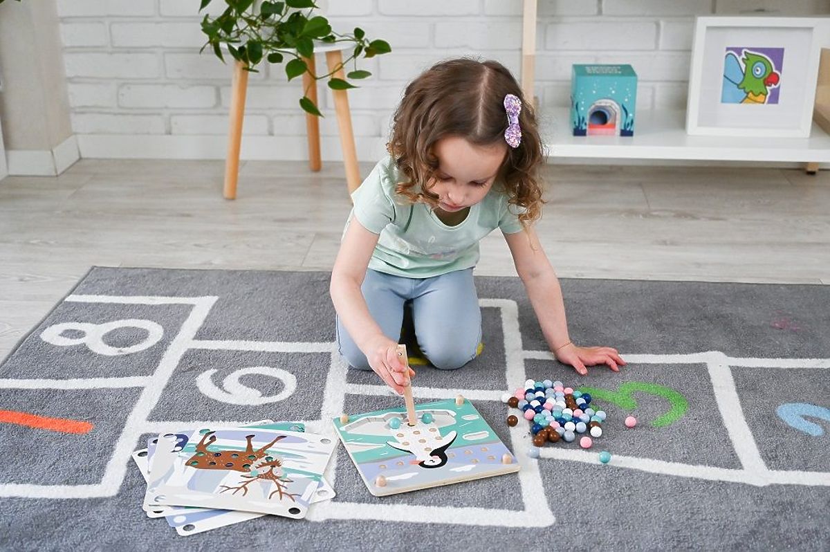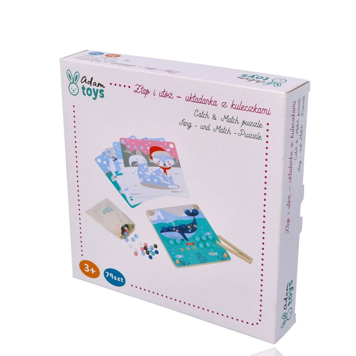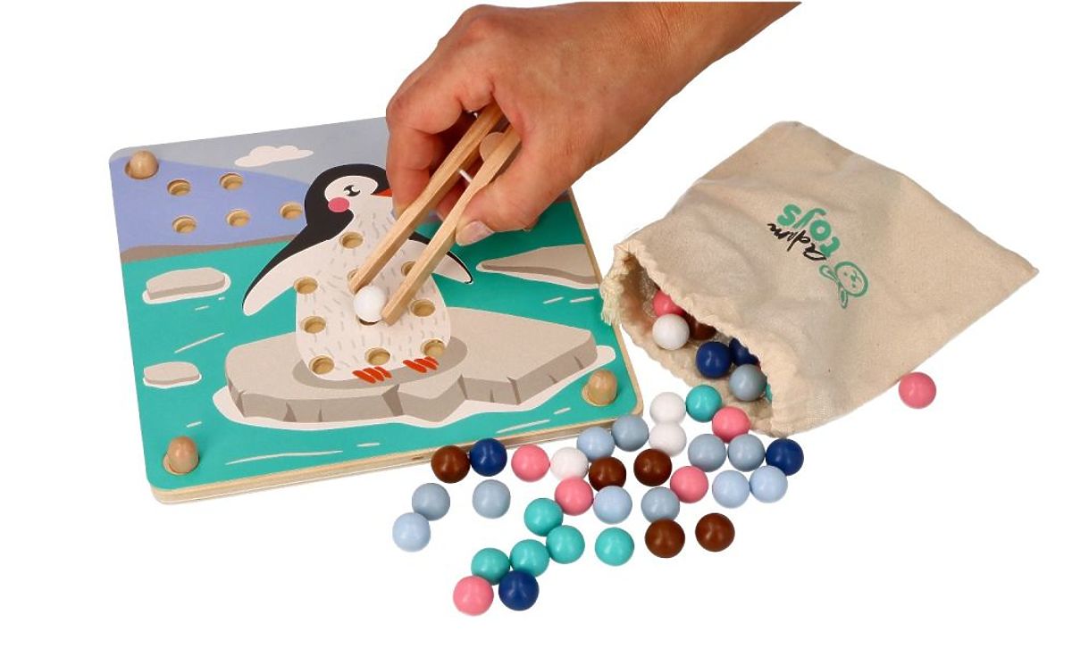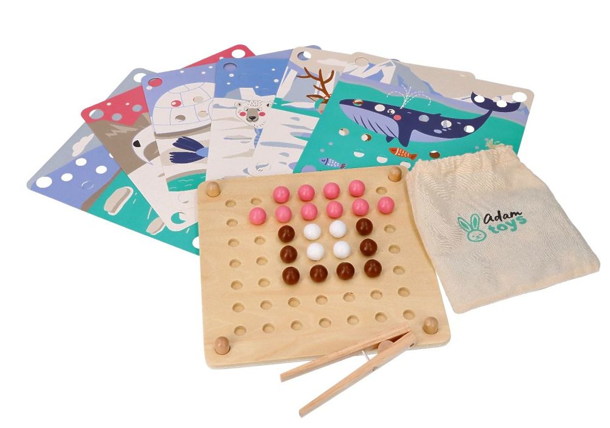 Ďalšia skvelá ponuka od známeho výrobcu hračiek Adam Toys. Tentokrát ide o zručnostnú skladačku s novými arktickými hrdinami. Sada sa skladá z drevenej základne s vyvŕtanými otvormi, 6 farebných dosiek so zvieratkami zo série a 71 farebných guľôčok a drevených klieští.