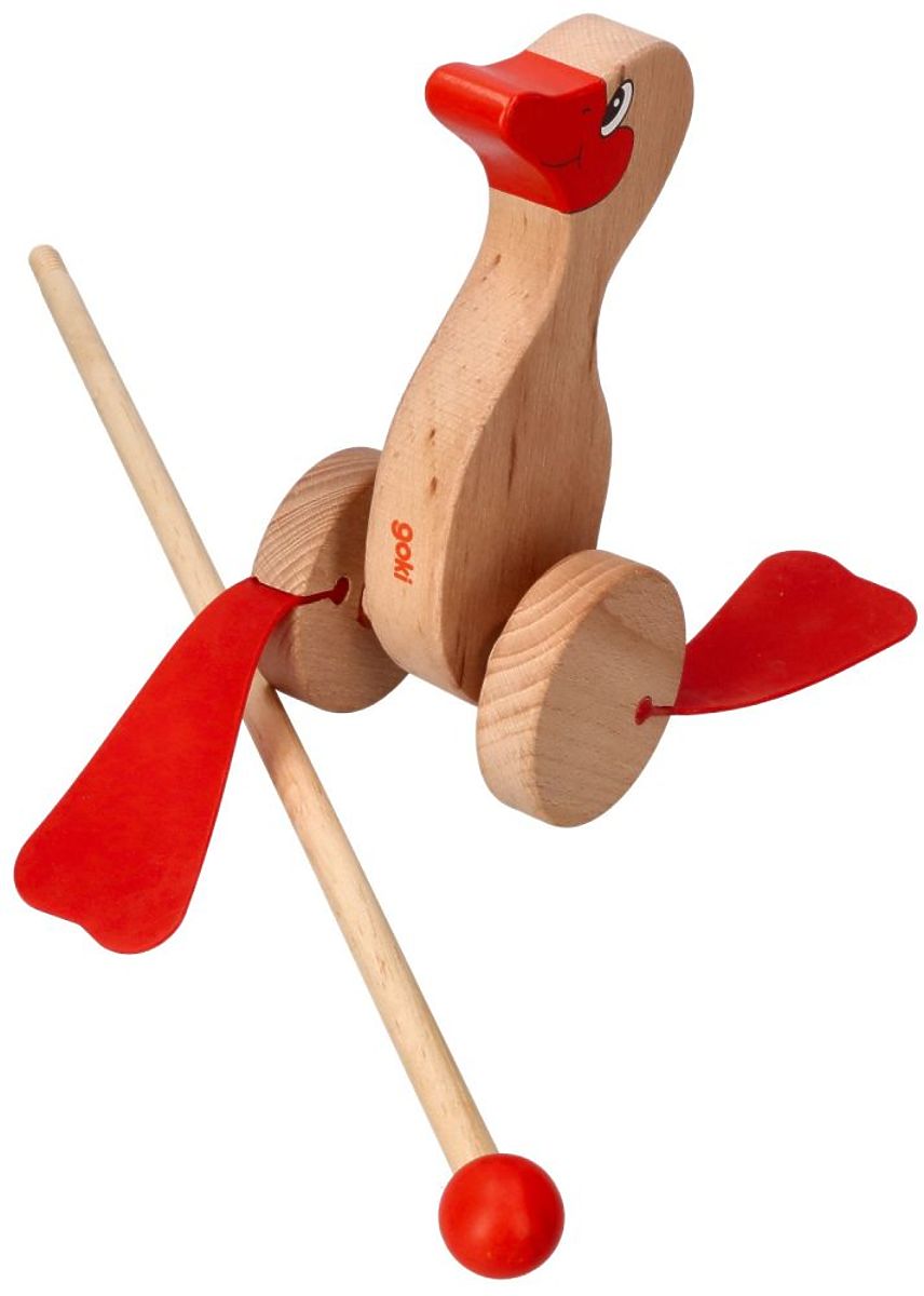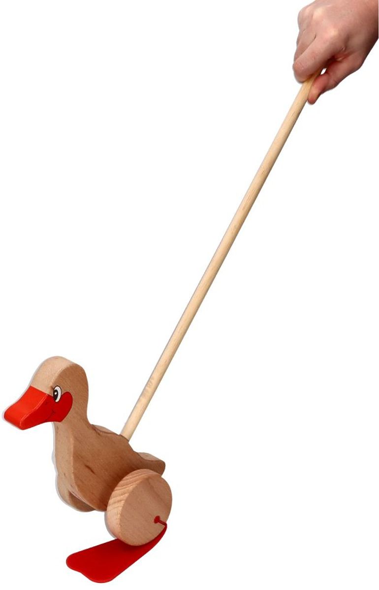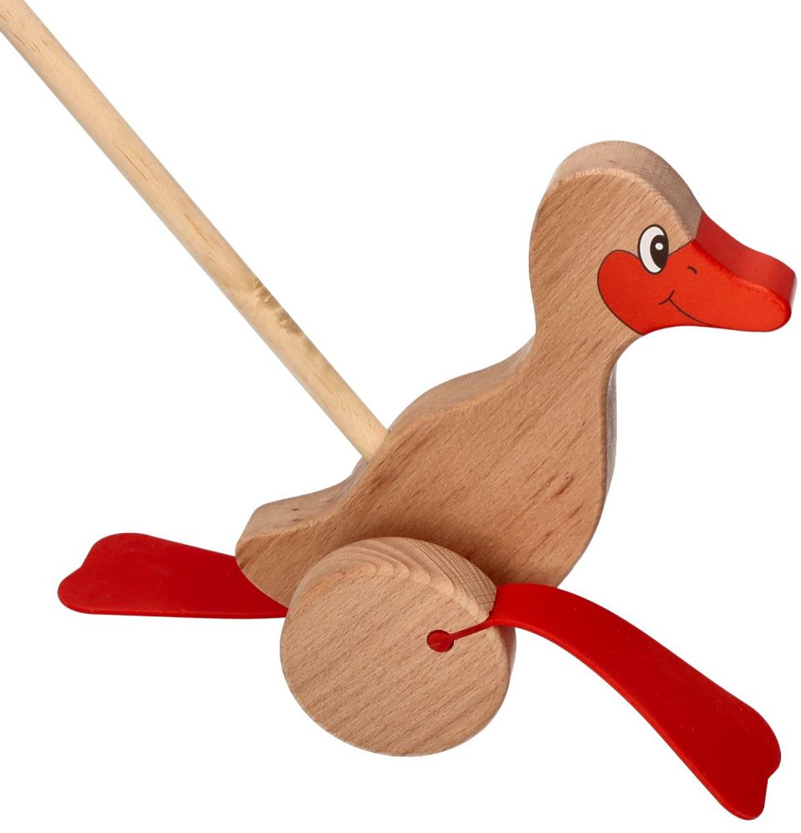 Kačica je vyrobená úplne z dreva a prvky pri kolesách sú z gumy. Tyčka je priskrutkovaná.