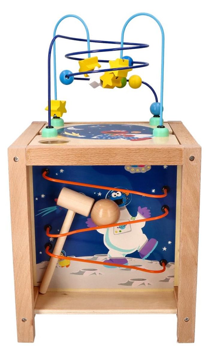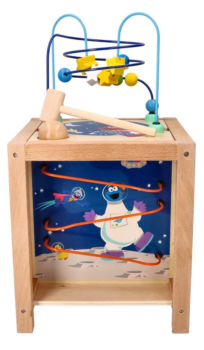 - Posledná z bočných strán je kovová šmykľavka pre guličky. Je úzko spojená s hornou stranou, pretože guličku je potrebné zatĺcť priloženým kladivkom práve otvorom umiestneným hore na kocke. 3 kovové tyčky zabezpečujú, že gulička pomaly schádza dole na pozadí mesačnej krajiny. Celkový vzhľad završuje postava zábavného Cookie Monstera zo série Sezamová ulica. Ak sa dobre pozriete, možno nájdete viac obľúbených postáv?