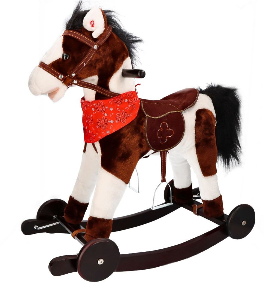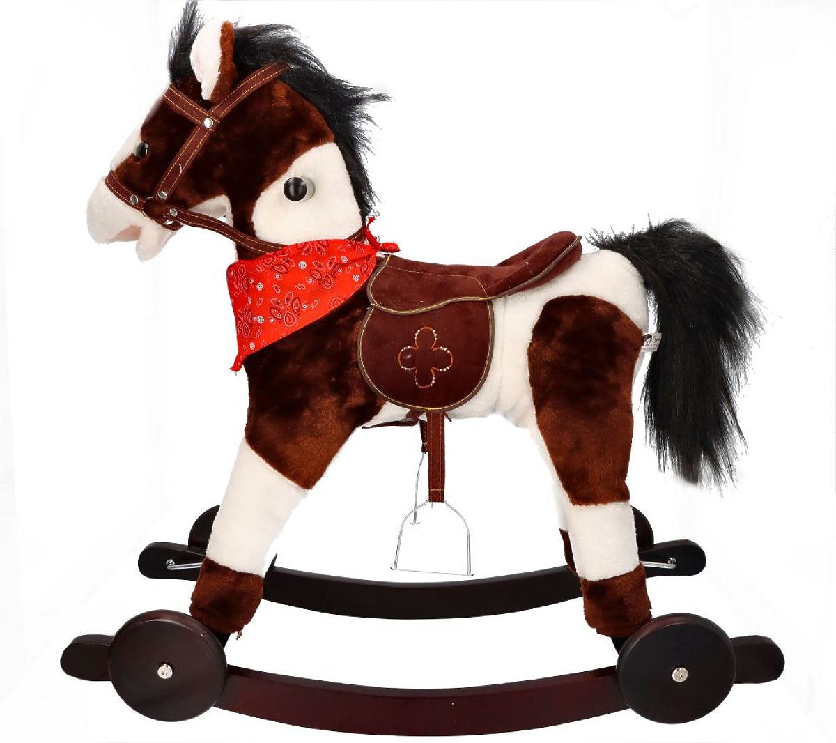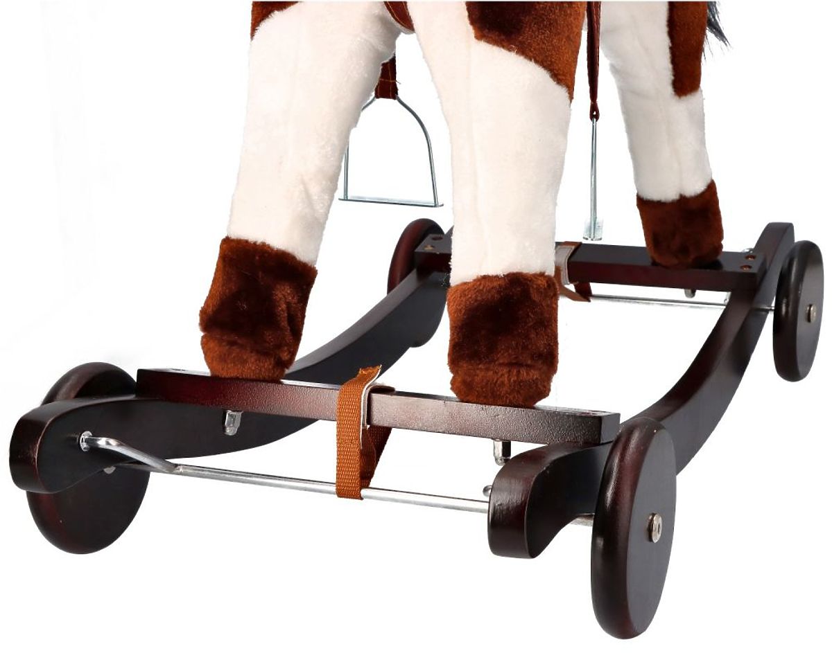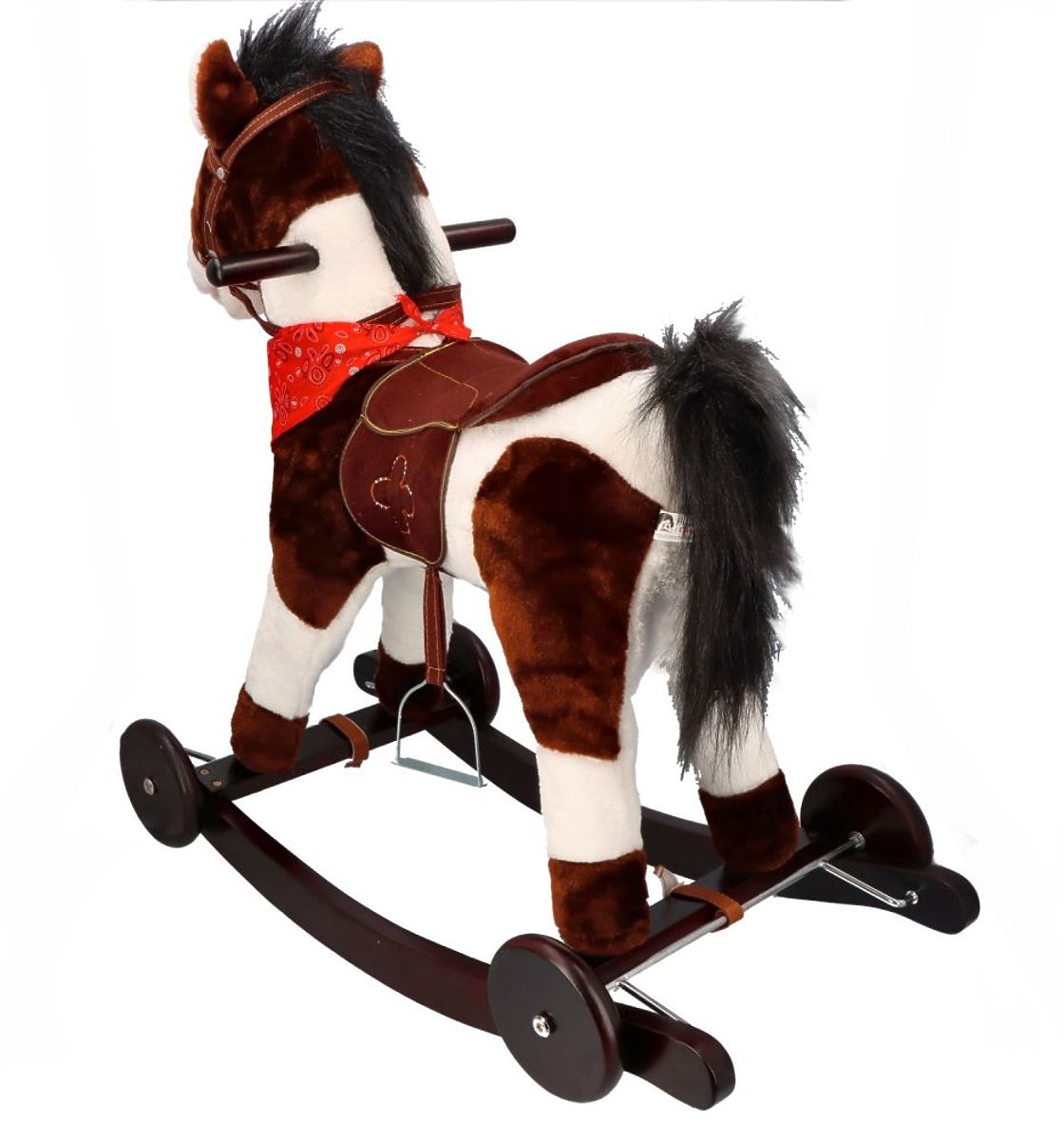 Kôň tmavohnedý s bielymi škvrnami a čiernym chvostom a hrivou. Má drevené lyžiny a úchyty v tmavej farbe. Je to klasický hojdací kôň, akého si mnohí z nás pamätajú z detstva.