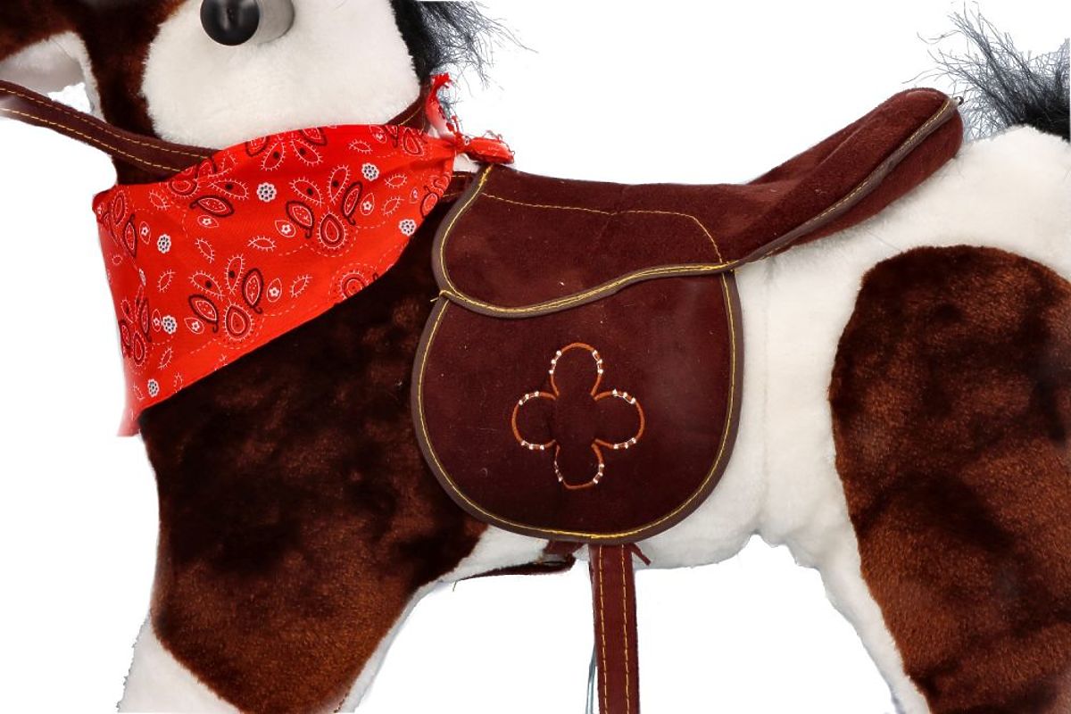 Hojdací kôň je vybavený sedlom a uzdou ako skutočný kôň. Všetko je vyrobené s dôrazom na detaily a vysokú kvalitu hračky. Sedlo je špeciálne tvarované, aby dieťa pohodlne sedelo. Sedlo je dokonca vybavené kovovými strmeňmi. K tomu červená šatka hrdo zakrýva jeho krk. Skutočný koník Łatek Divokého západu!