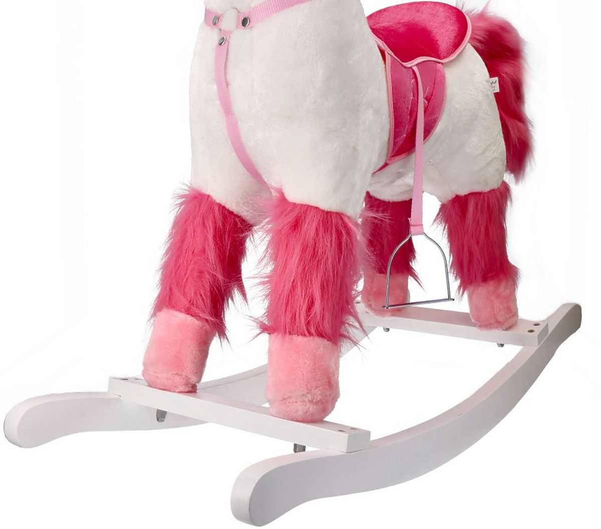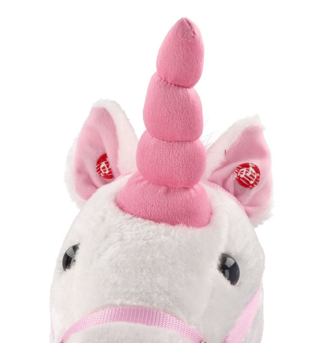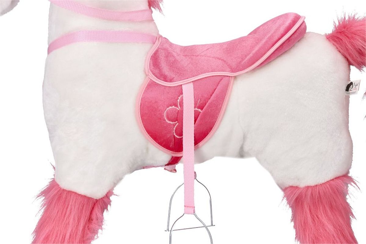 Kôň je vyrobený z mäkkého plyšového materiálu v bielej farbe. To, čo mu dodáva čaro a charakter, sú ružové doplnky: roh, kopytá, hriva, chvost a krásne strapce na nohách, typické napríklad pre frízske kone a samozrejme jednorožce;-) Ružové sú tiež prvky jazdeckého vybavenia, t.j. sedlo a uzda. Kôň má biele, drevené lyžiny a úchyty.