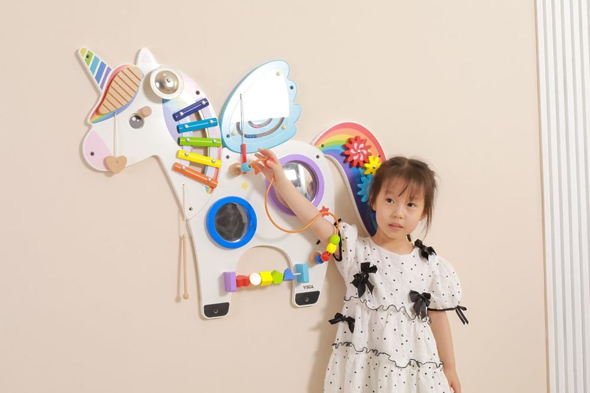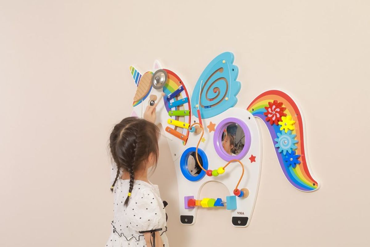 Čarovný svet jednorožcov a mystických bytostí vždy vzbudzoval medzi deťmi veľký záujem. Možno preto, že to, čo je nezvyčajné, nás vždy viac zaujíma :) Tentoraz môžete pozvať jednorožca do svojej izby, aby s vami býval. Tento roztomilý jednorožec vo forme nástenného panelu na hranie a učenie bude tiež krásnou dekoráciou. Deti sa môžu hrať samostatne alebo spoločne v skupine a pritom sa veľa naučiť, napríklad tvary, farby, zvuky alebo vyjadrovanie emócií.