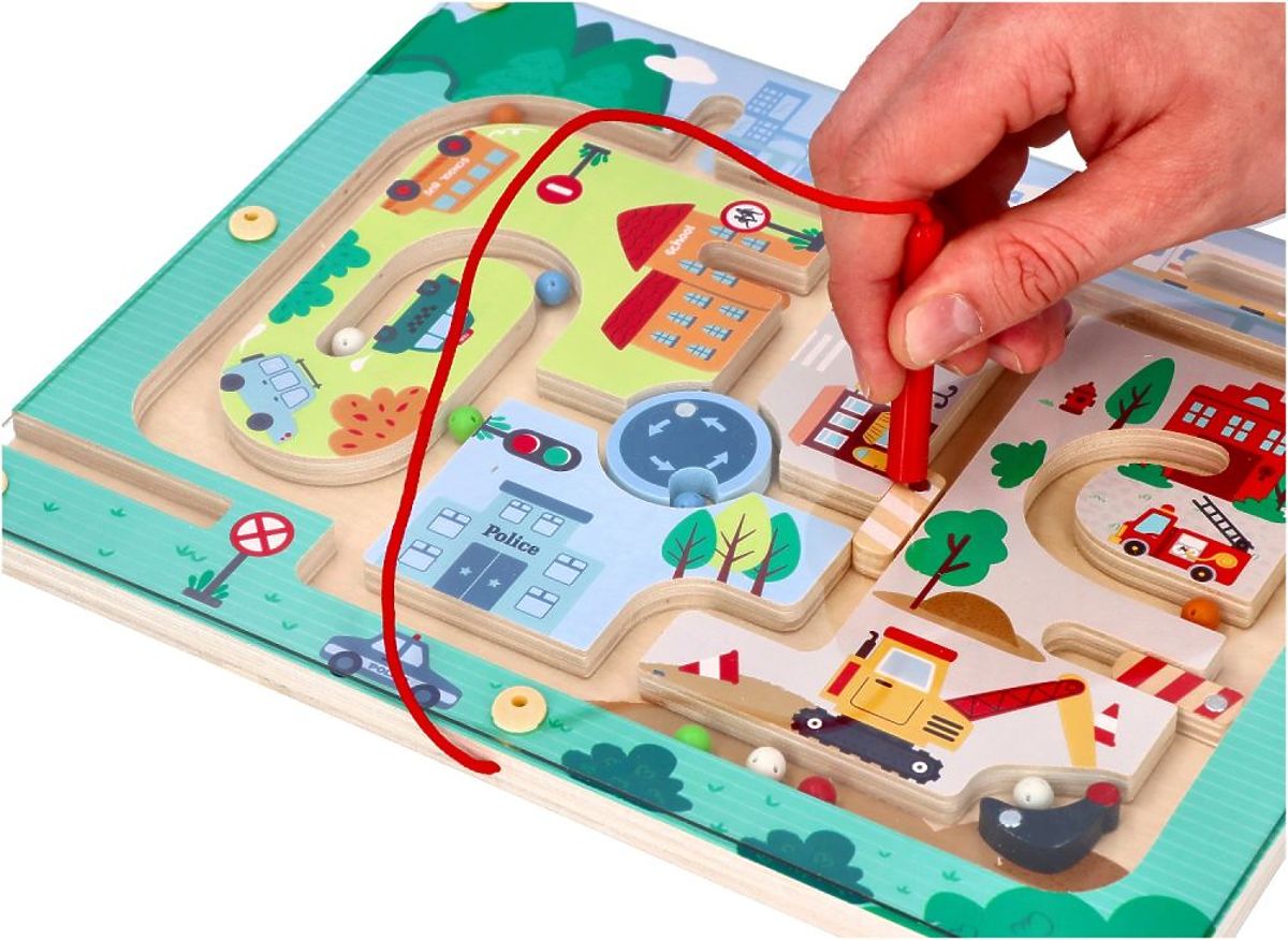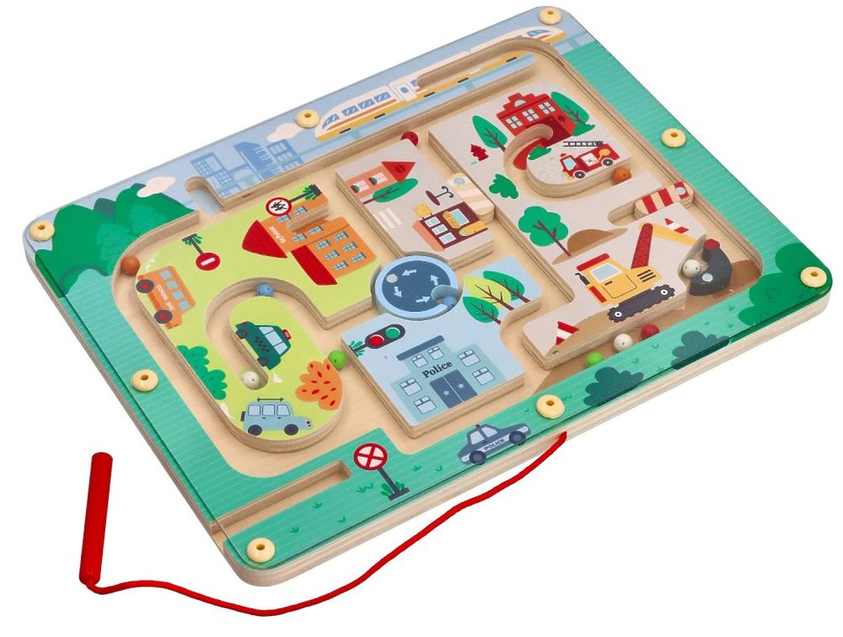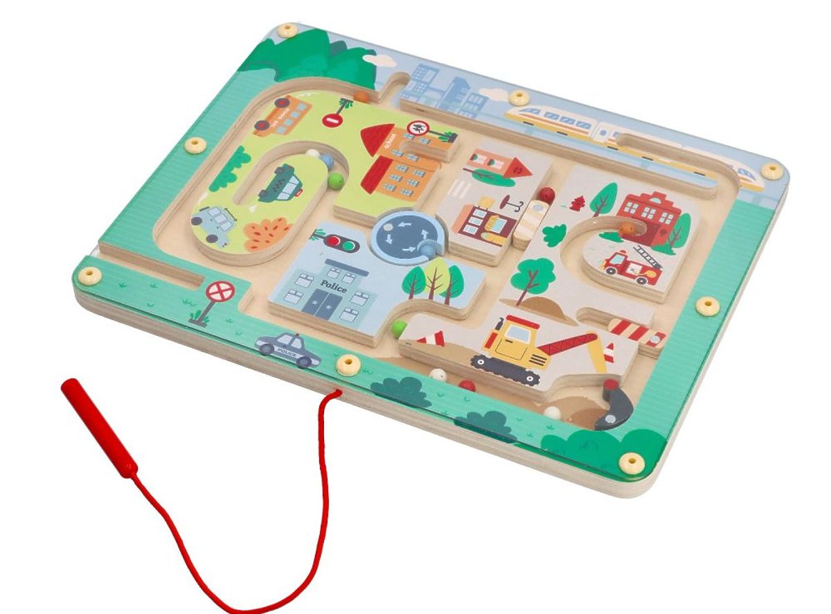Magnetické bludisko je drevená doska s krásnou potlačou, na ktorú je položené priehľadné plastové sklíčko. Spoločne zabraňujú vysypaniu guličiek von. Magnetická tyčinka pripojená k základni a spojená s ňou šnúrkou má tiež svoje miesto. Navyše majú guličky dierky, čo ich robí ľahkými a ľahko pohyblivými. Skvelá kvalita za dobrú cenu.