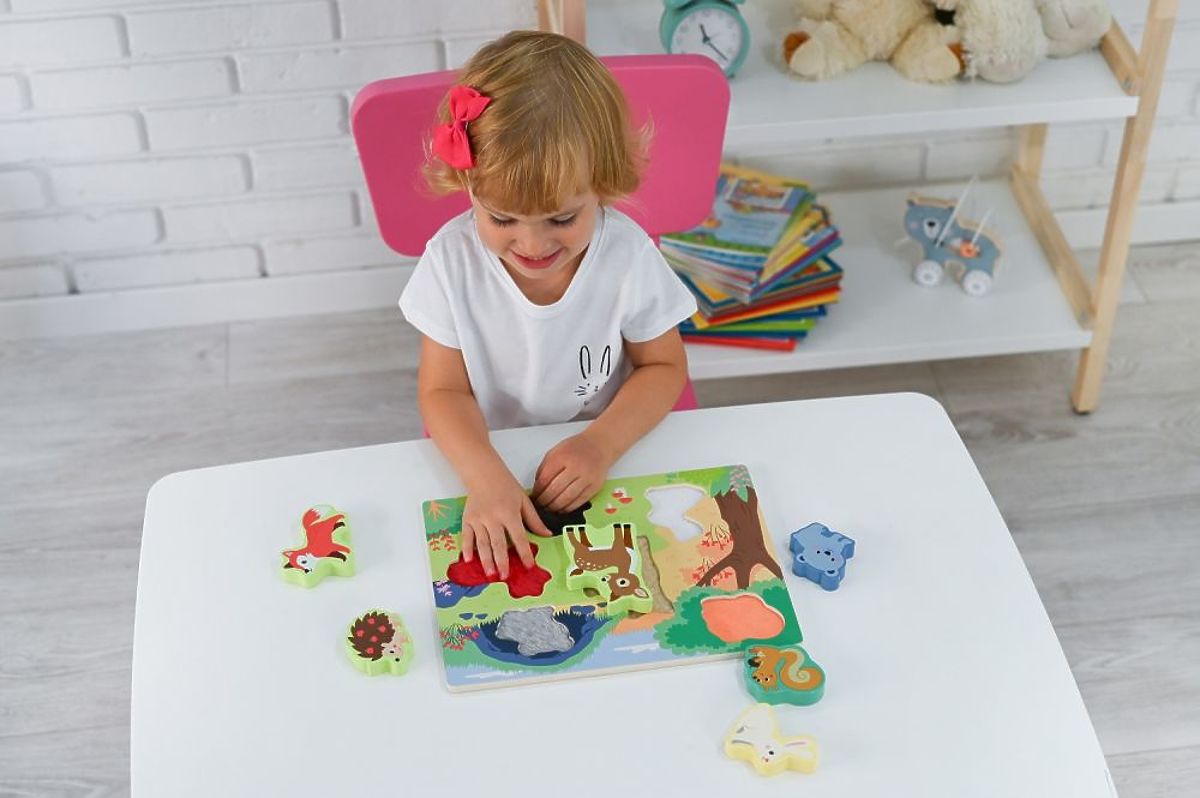 Veselá multifunkčná skladačka Lesné zvieratá. Dieťa si pri hre so skladačkou prispôsobuje prvky do prázdnych miest a zároveň spoznáva lesné zvieratá. Nájdete tu zajaca, ježka, líšku, veveričku, medveďa a srnku.