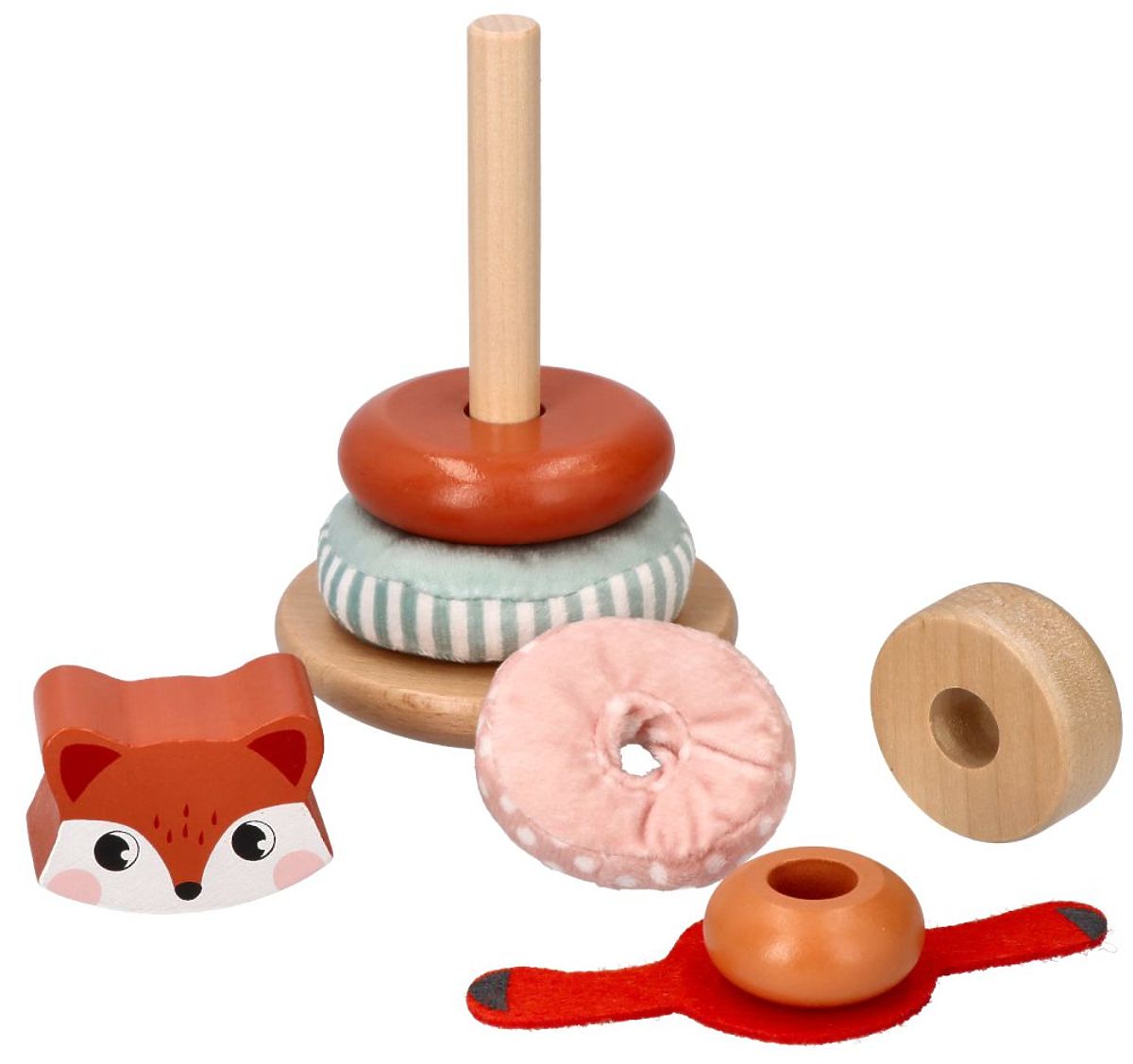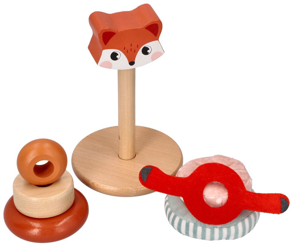 Farebná pyramída s drevenými a látkovými krúžkami a hlavou líšky. .. viac