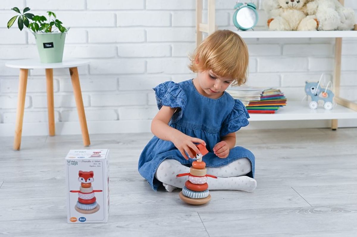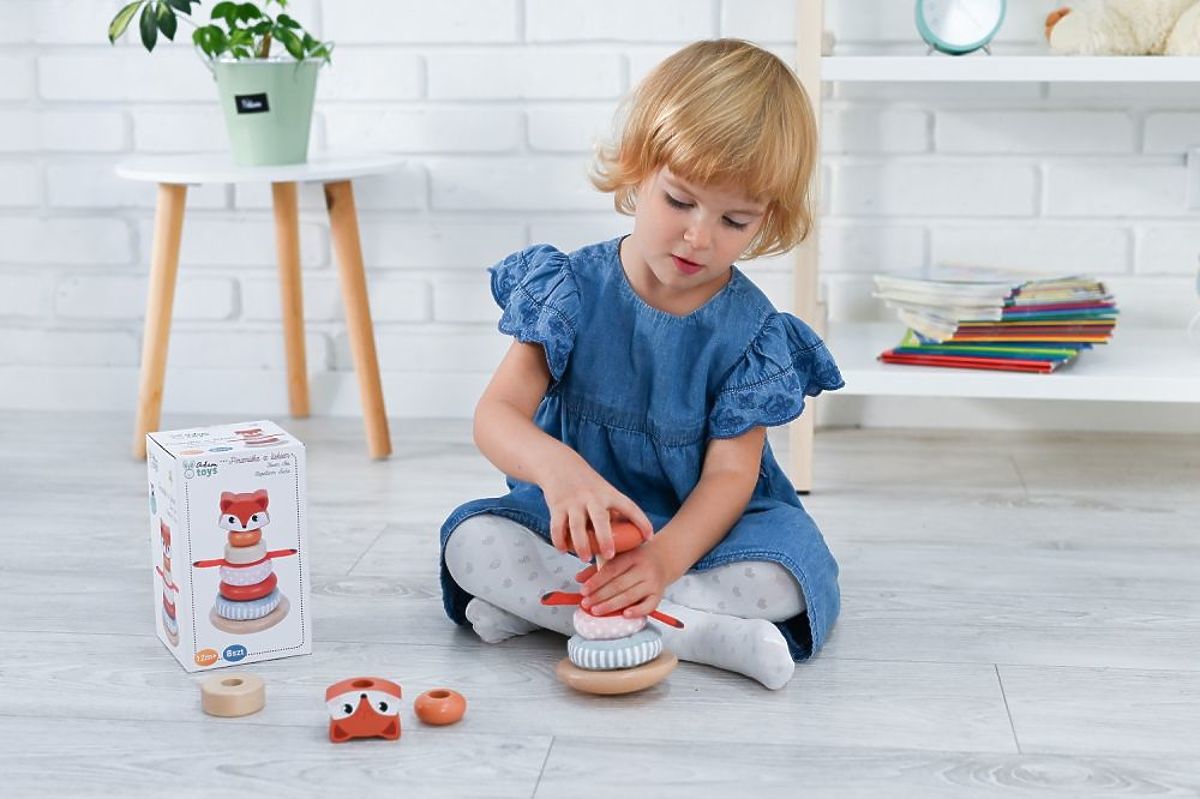 Krásna pyramída Adam Toys je klasická hračka pre každé malé dieťa. Zaujme krásnou farebnosťou a dizajnom. Čo túto hračku odlišuje, je kombinácia nielen rôznych farieb, ale predovšetkým materiálov, z ktorých sú krúžky vyrobené. Najväčší krúžok je z prírodného dreva a ďalšie prvky sú ako drevené, tak látkové. Mäkké krúžky sú vyrobené z materiálov príjemných na pohľad aj na dotyk. Nechýba ani prvok v podobe líščích labiek, ktoré je potrebné umiestniť na správne miesto. Celú pyramídu korunuje veselá hlava líšky.