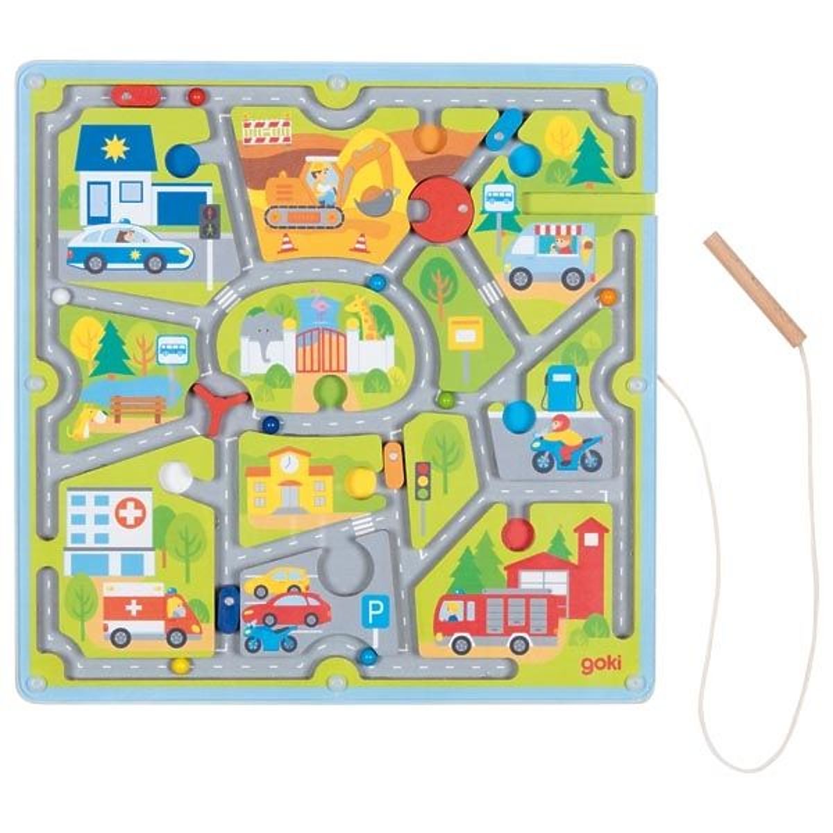 Magnetické bludisko je drevená doska s farebnou potlačou. Po priložení magnetickej tyčinky k doske môžu deti posúvať guličky v bludisku. Guličky je možné viesť ľubovoľným, vymysleným spôsobom, čím sa cvičí zručnosť rúk. Magnetická tyčinka je pripevnená k bludisku šnúrkou, takže sa nestratí. Má tiež špeciálne miesto na uloženie.