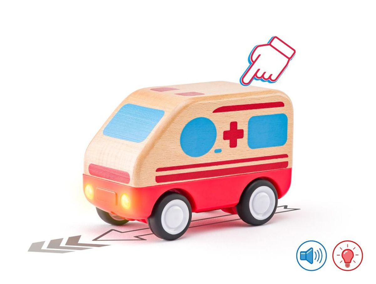 Nová kolekcia vozidiel značky Woody sú autíčka prispôsobené svojou veľkosťou malým rukám. Sú vyrobené z dreva s plastovými prvkami, natreté farbami bezpečnými pre deti. Majú mäkké gumové pneumatiky, vďaka čomu majú dobrú priľnavosť k povrchu. Po stlačení autíčka sa rozsvietia svetlá, počujeme signál a vozidlo sa začne rozbiehať. V balení sú 3 batérie LR44 1,5 V.