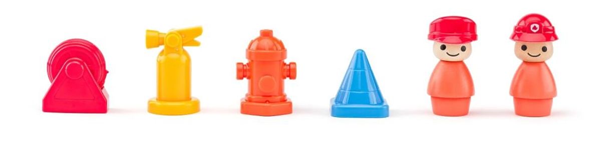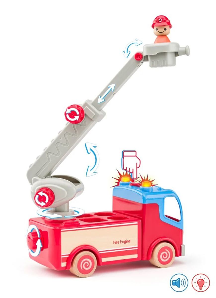 Hasičské auto je vyrobené z kombinácie vysoko kvalitného plastu a dreva a obsahuje mnoho záchranného vybavenia, vrátane 2 figúrok hasičov. Má vysúvací otočný rebrík s plošinou a stlačením tlačidla na kabíne vodiča sa aktivuje svetlo a zvuk. Vozidlo má šnúrku na ťahanie hračky.