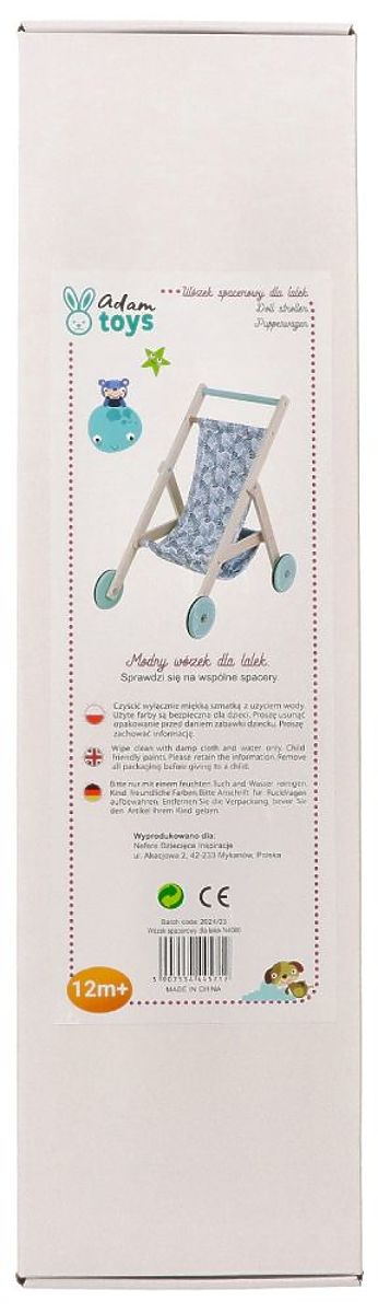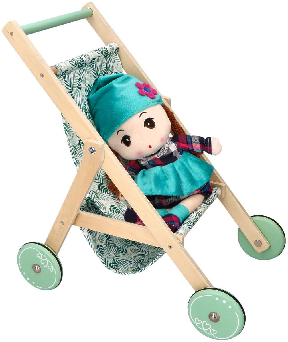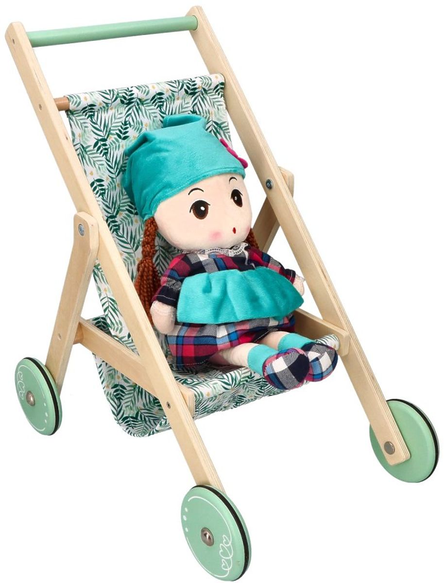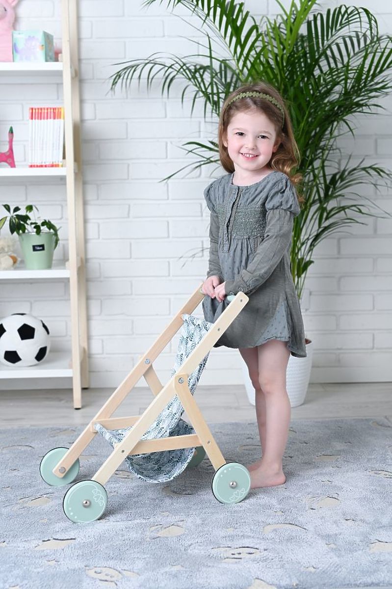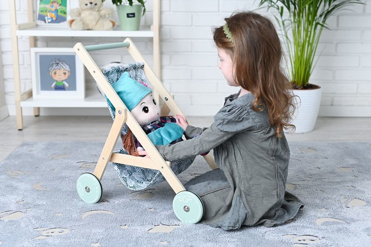 Ľahký, drevený kočík pre bábiky je novým návrhom od AdamToys na letné prechádzky malého dieťaťa s obľúbenými bábikami. Odteraz sa prechádzky stanú neobyčajnou atrakciou vďaka roztomilému vzhľadu kočíka a jeho ľahkej konštrukcii. Kočík sa tlačí veľmi hladko vďaka veľkým kolesám s gumovými protišmykovými pásikmi a nízkej hmotnosti. Kočík je vyrobený z dreva s mätovými akcentmi na kolesách a rukoväti. Bábika alebo medvedík môže byť usadený na sedadle s krásnymi zelenými vetvičkami. Celkový vzhľad je veľmi pôvabný a určite pritiahne nejeden pohľad na promenáde a ihrisku.