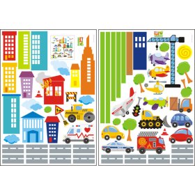 Farebné samolepky pre malých priaznivcov vozidiel! Táto dekorácia vytvorí v izbičke svet plný pohybu - lietadiel, áut, budov a staveniska.