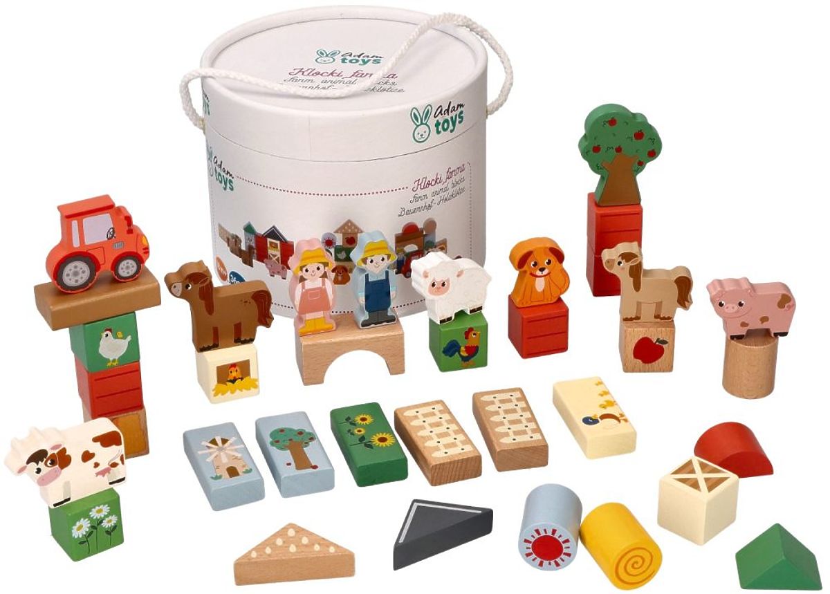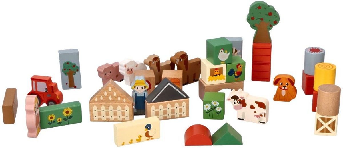 Postavte si vlastnú farmu! Malý farmár by si mal vyhrnúť rukávy, pretože ho čaká veľa práce :) Zvieratká už sa nemôžu dočkať stajní a ohrád, ktoré pre ne vďaka týmto farebným kockám vytvorí malý staviteľ. Veľká sada obsahujúca 36 drevených kociek rôznych tvarov a veľkostí ponúka možnosti rôznorodých konštrukcií. Kocky sú ozdobené motívom farmy, čo vytvára jednotný celok a uvádza deti do sveta vidieckych zvieratiek. Vďaka hre dieťa rozvíja koordináciu ruka-oko a pri rozprávaní o tom, čo vidí, rozširuje svoju slovnú zásobu.